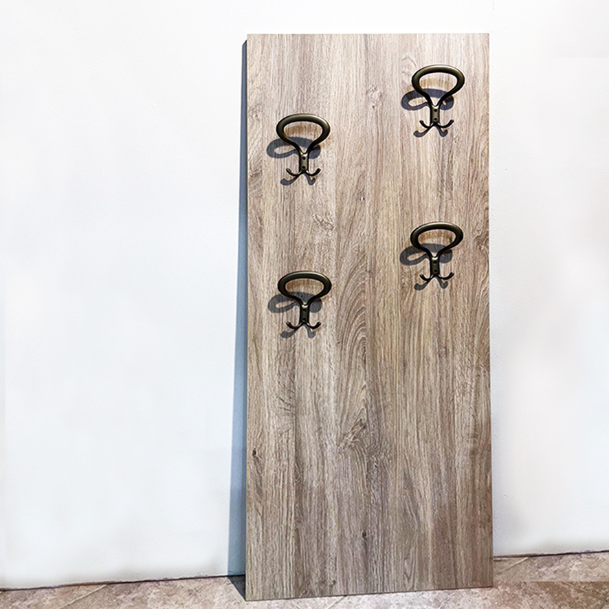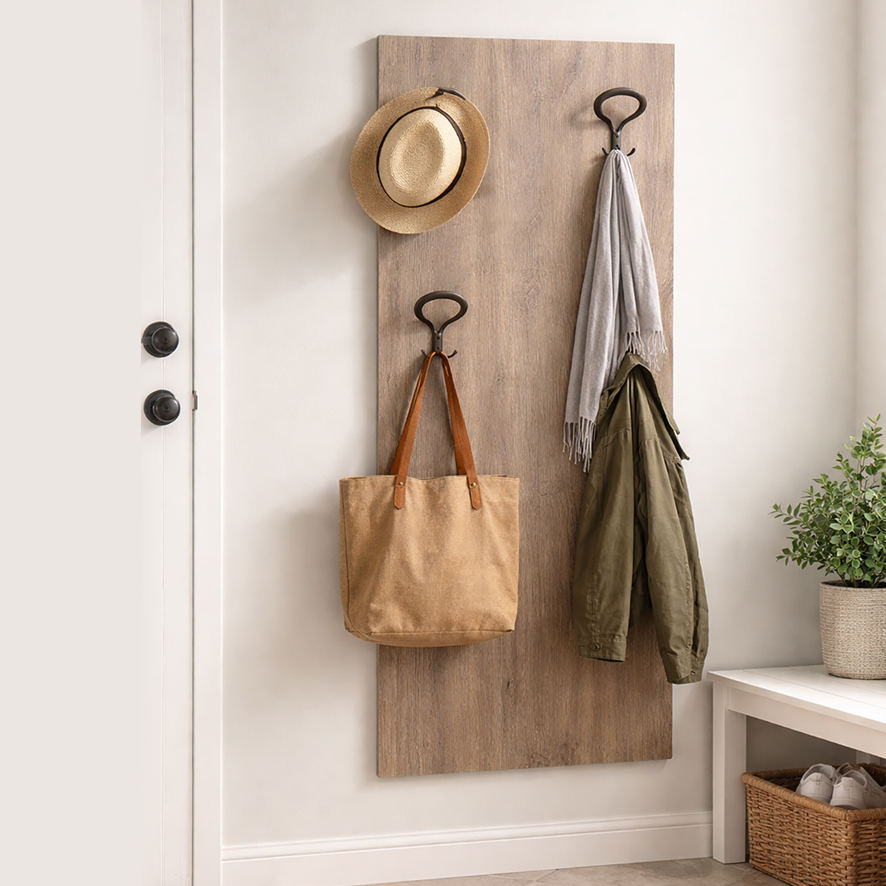 Realizzato con un pannello effetto legno naturale e quattro ganci in metallo dalla forma ad anello, unisce estetica e praticità in un complemento d’arredo pensato per la vita di tutti i giorni.