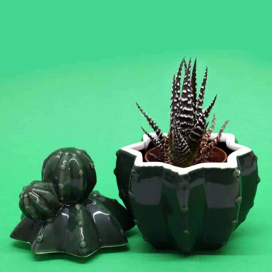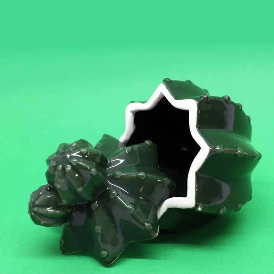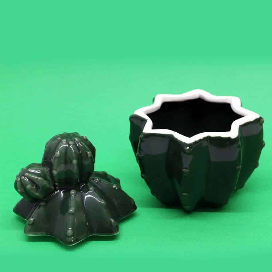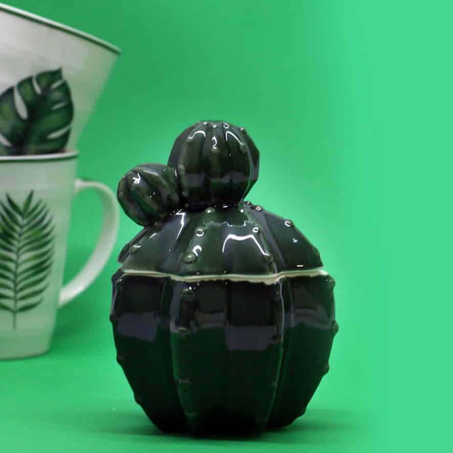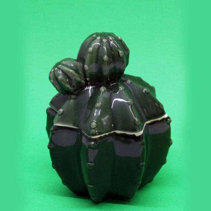 Il barattolo in terracotta lucida ha una linea esotica e riproduce le forme di un cactus.
