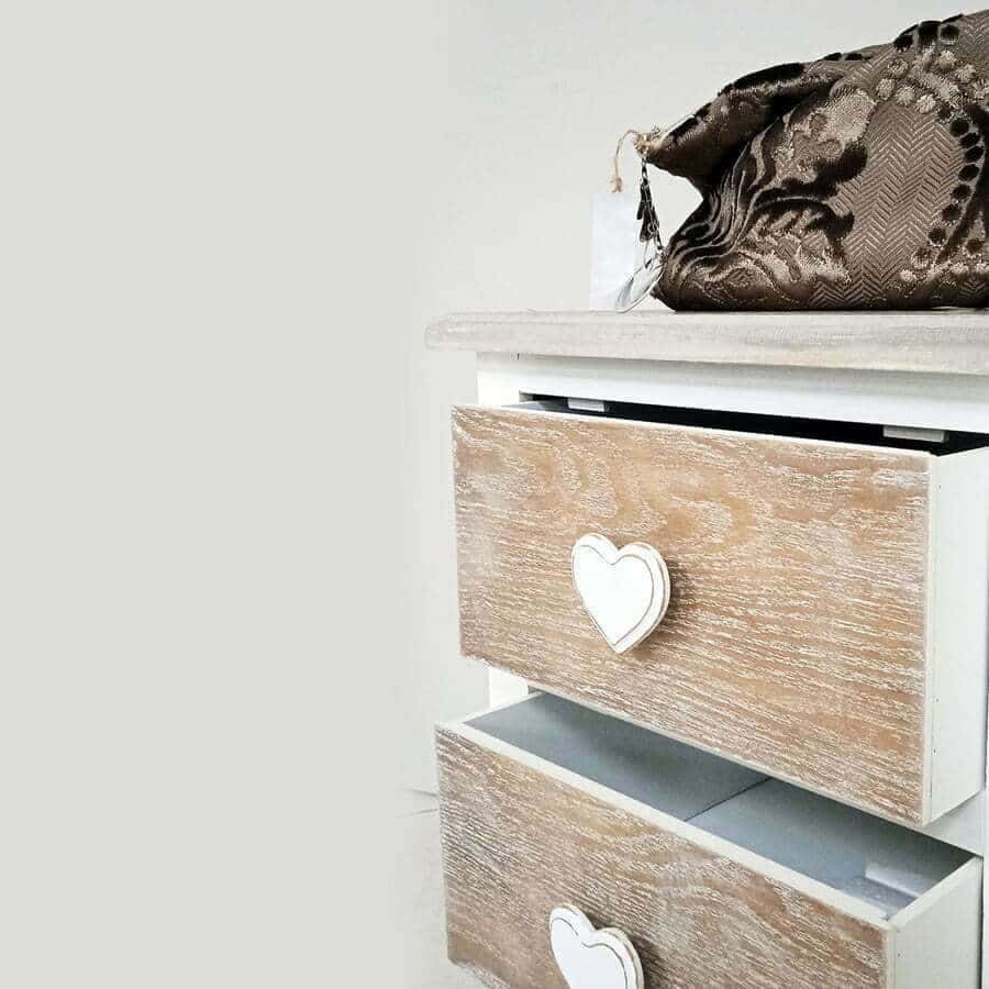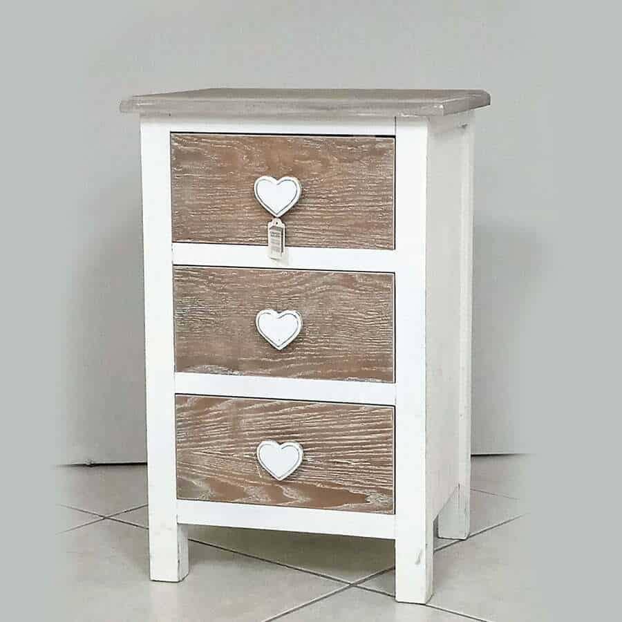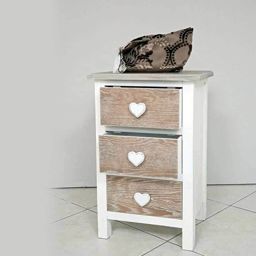 Cassettiera 3 cassetti in stile shabby chic con pomoli cuore