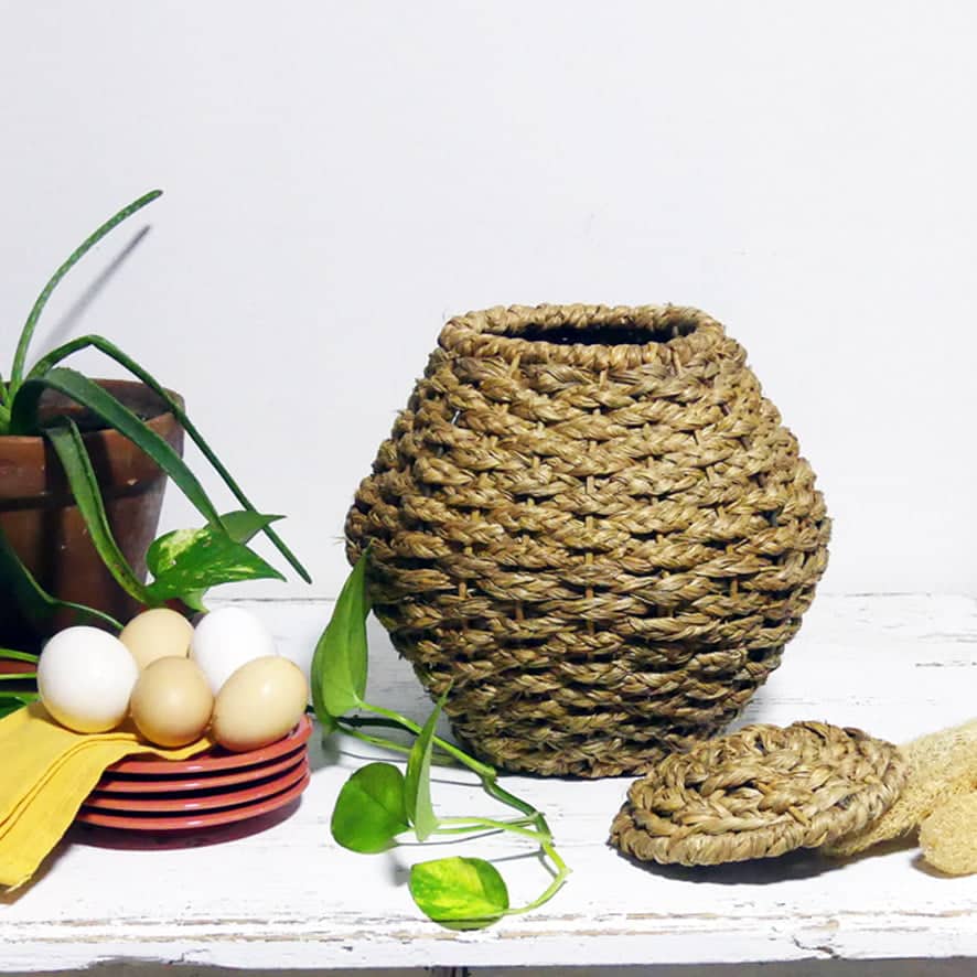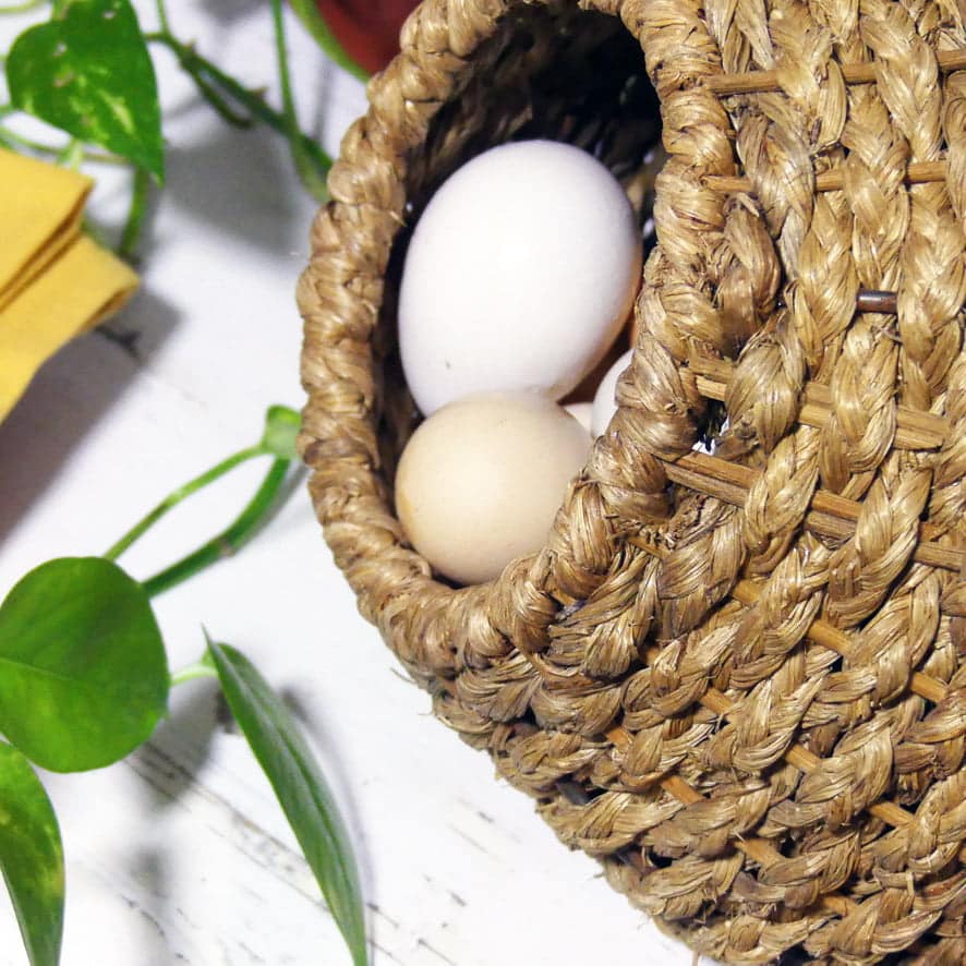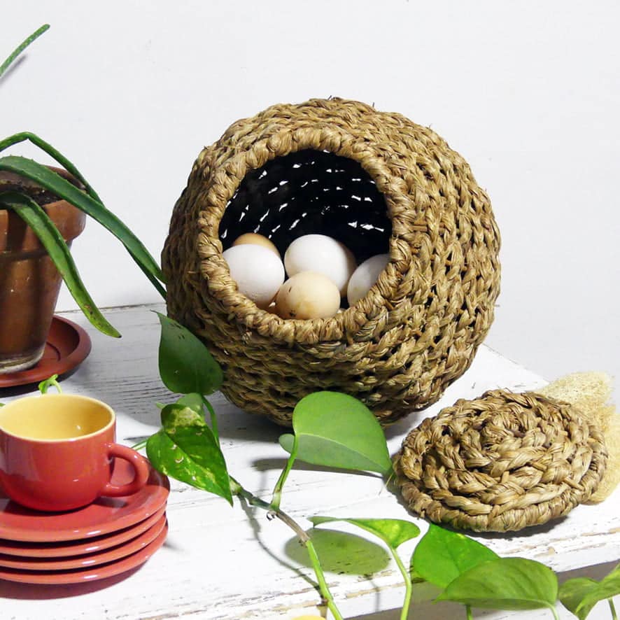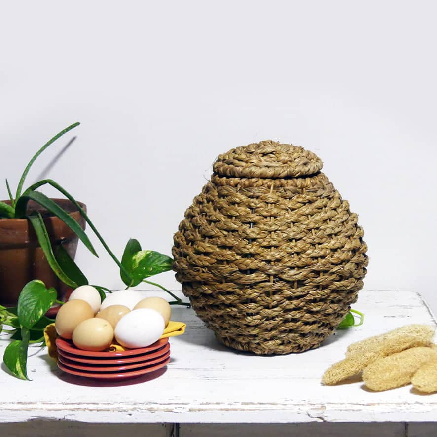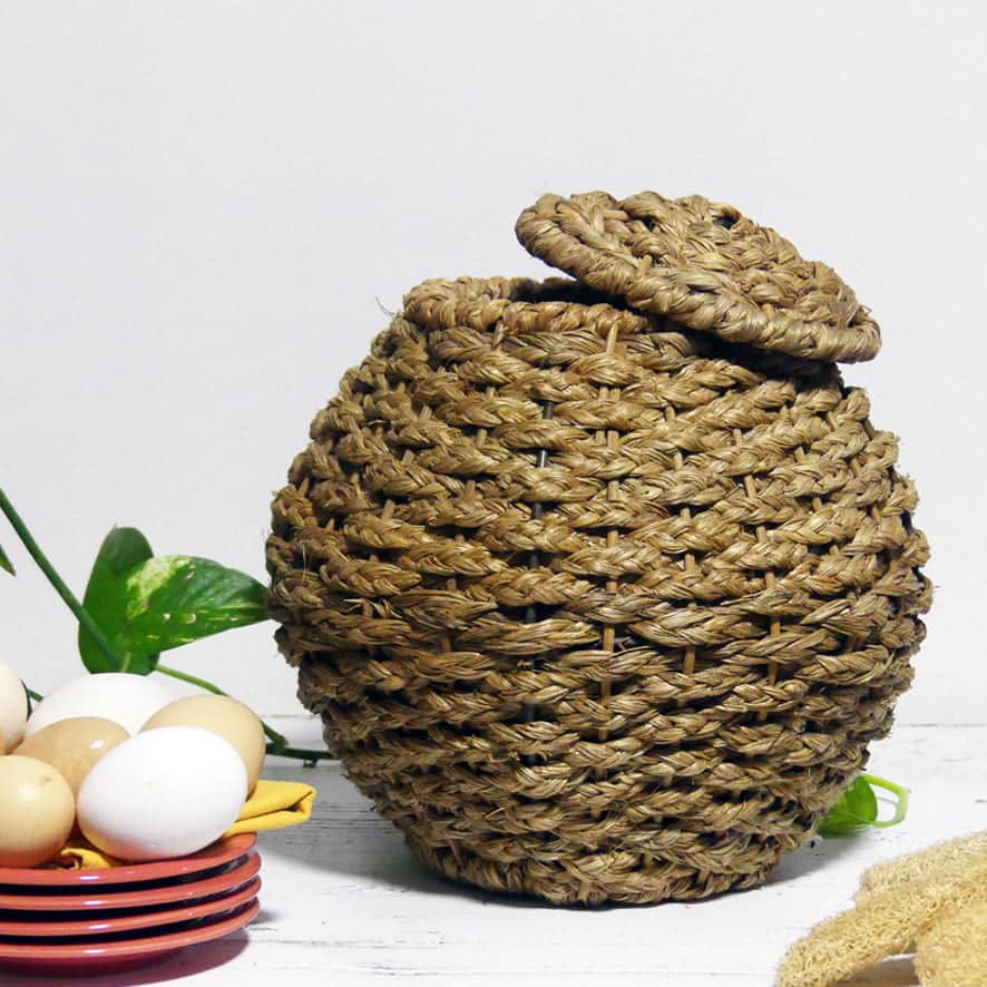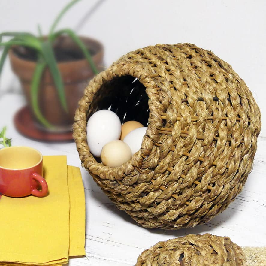 Cesto portauova robusto in vimini intrecciato con coperchio di forma esagonale.