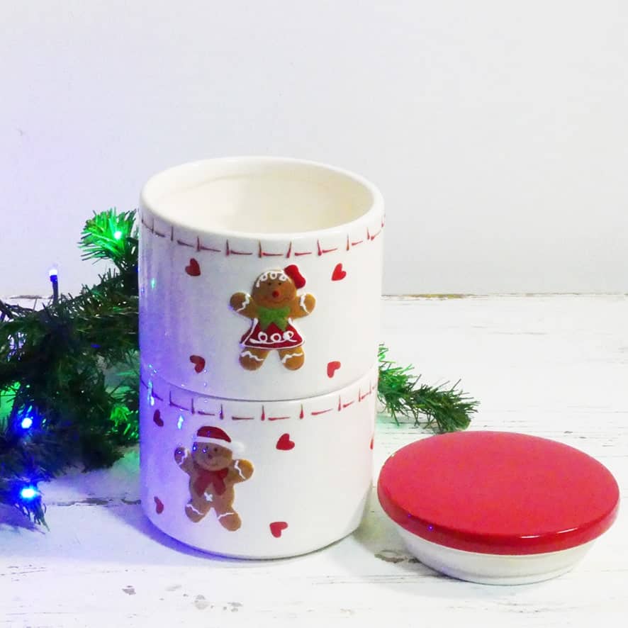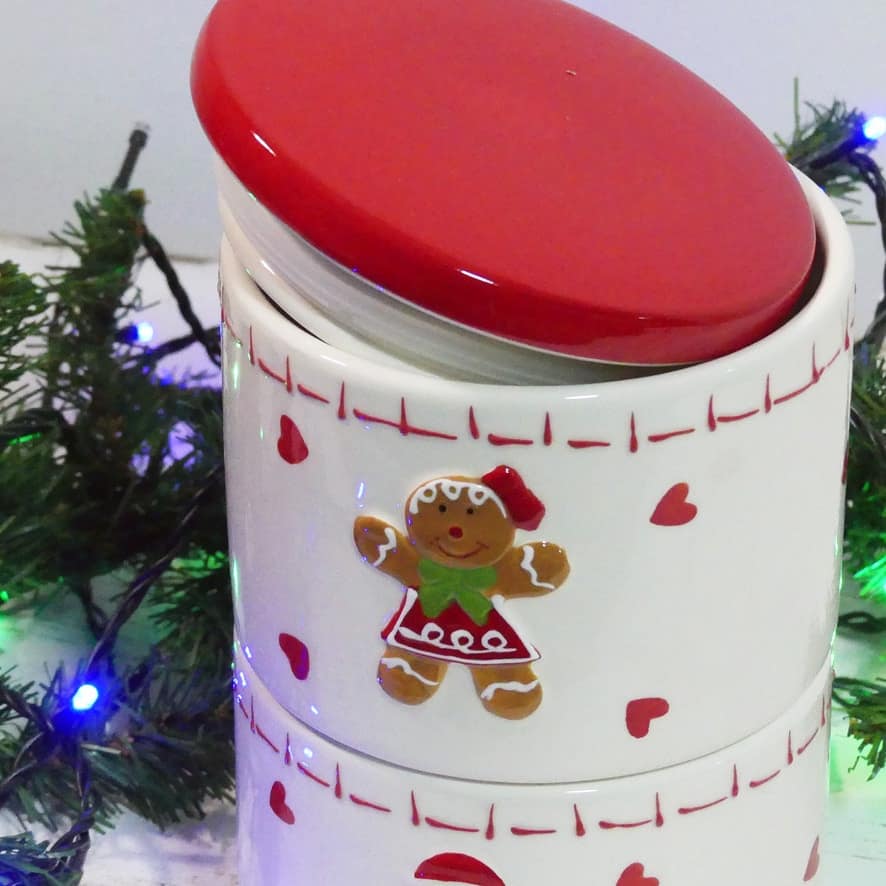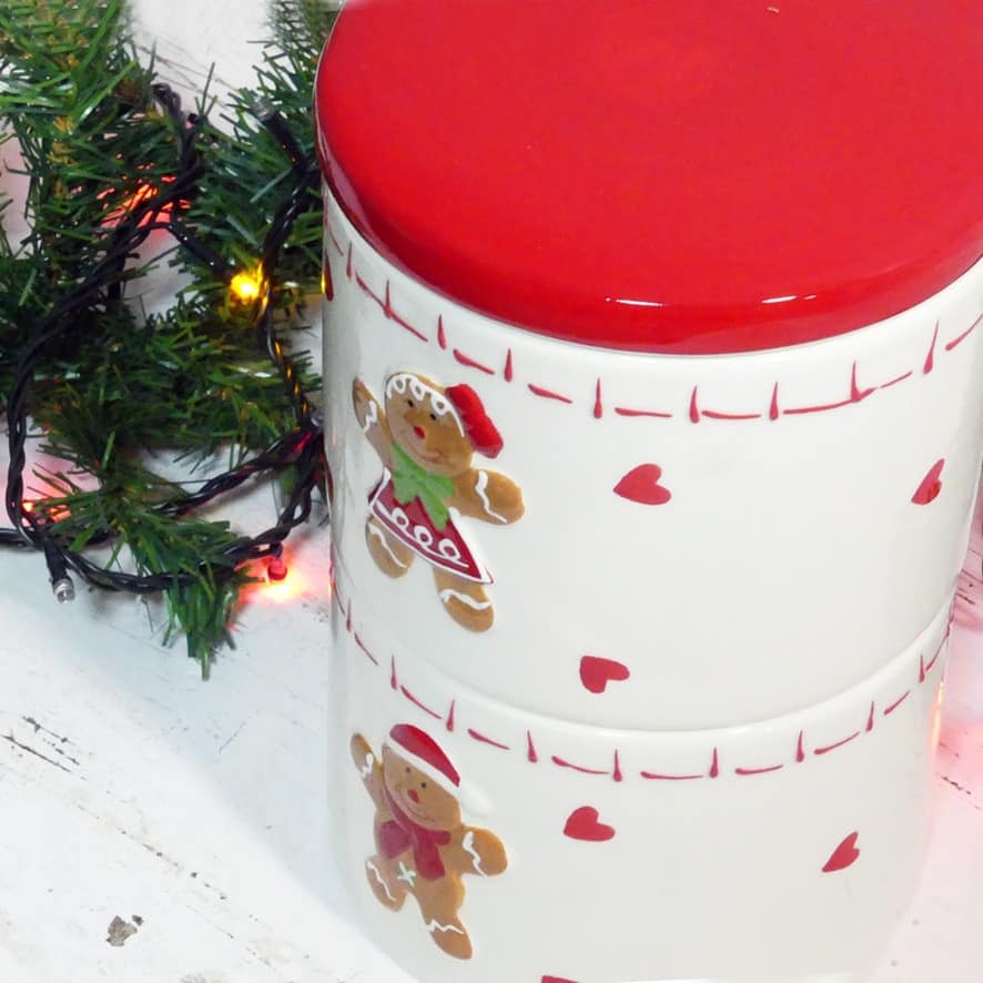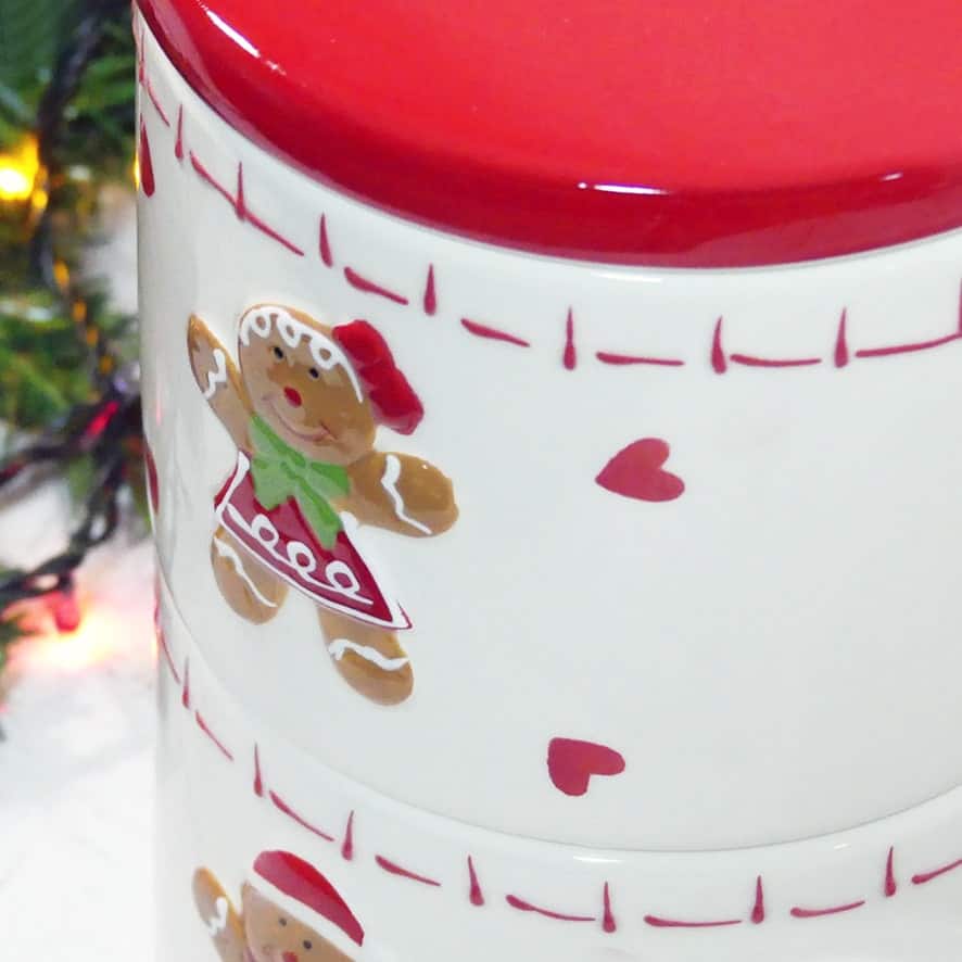 Contenitore biscotti con doppia ciotola in ceramica impilabile con coperchio e decoro natalizio a rilievo omino Pan di zenzero.