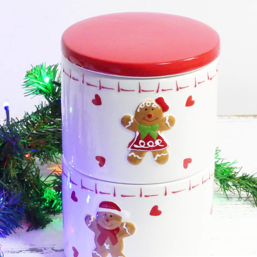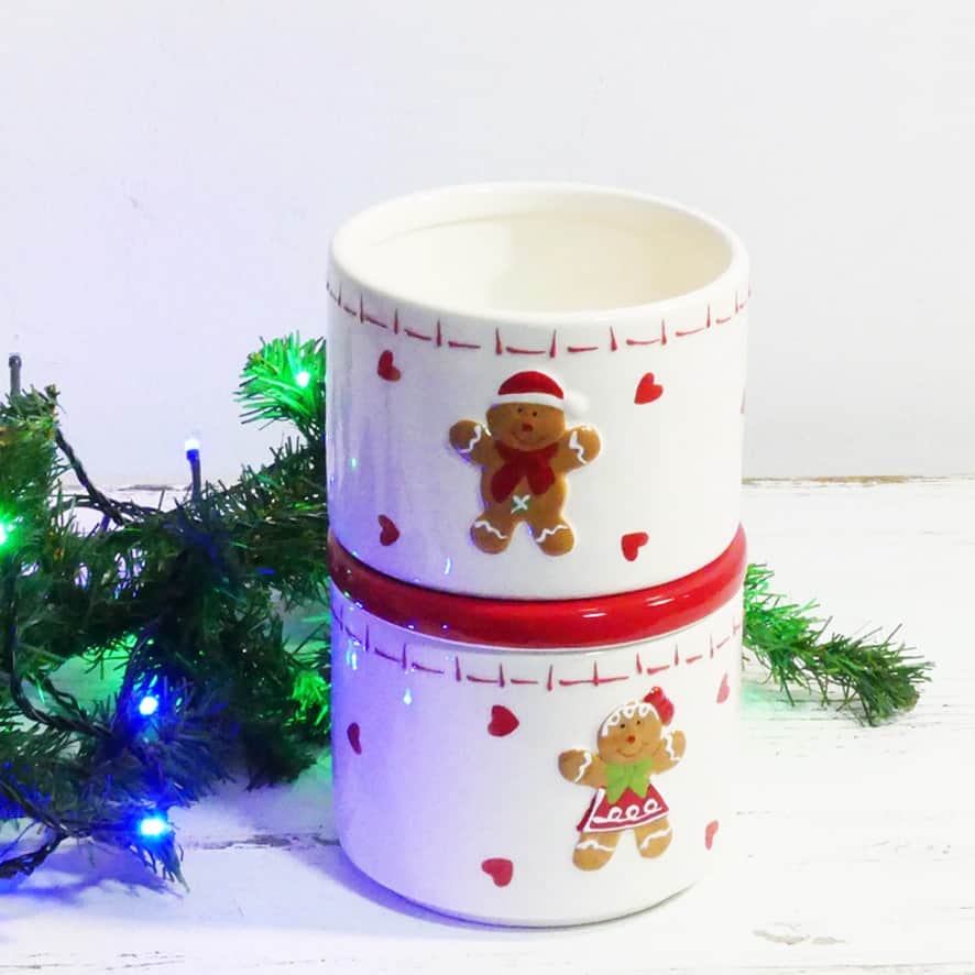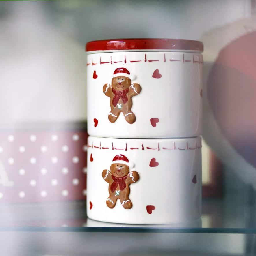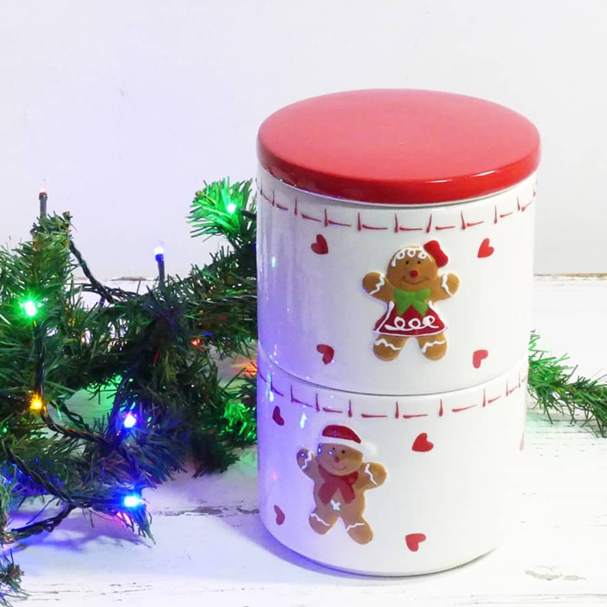 Contenitore biscotti con doppia ciotola in ceramica impilabile con coperchio e decoro natalizio a rilievo omino Pan di zenzero.