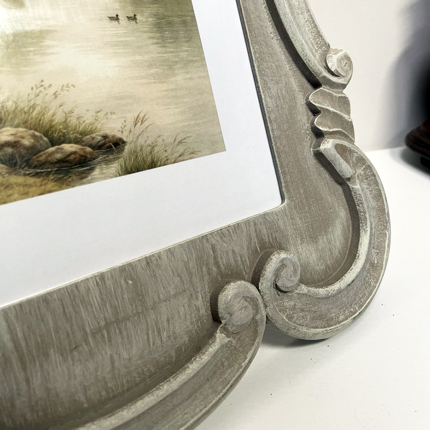 Cornice Bruma del Lago in legno massello con finitura effetto decapato color tortora caldo