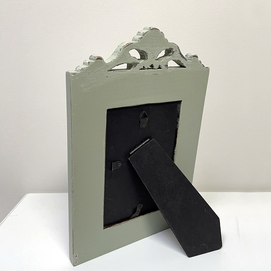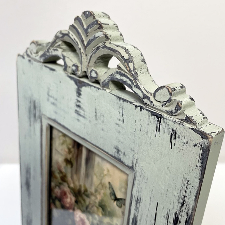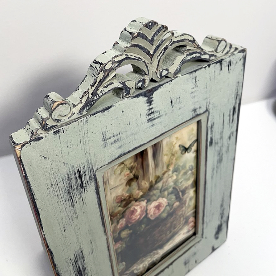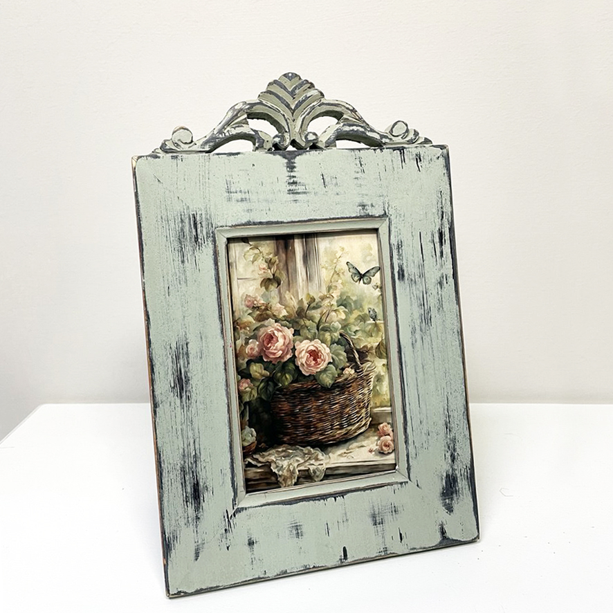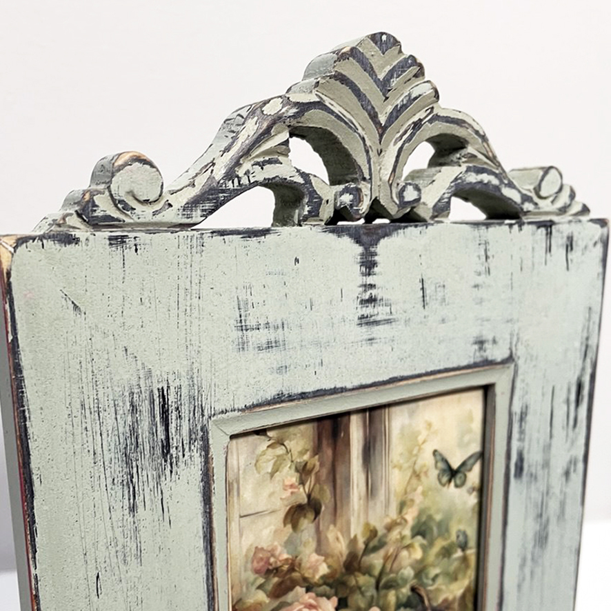 La finitura verde salvia decapata, con leggere abrasioni volutamente lasciate a vista, valorizza le venature del legno e dona alla cornice un fascino vissuto e romantico.