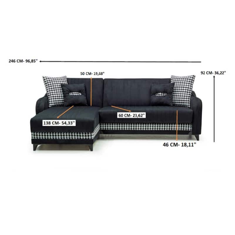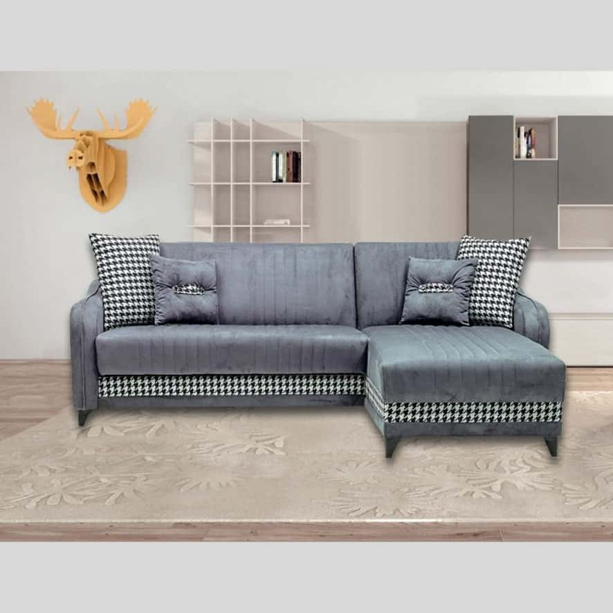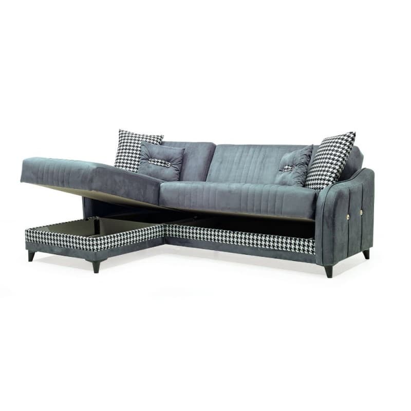 Ha penisola reversibile e doppio contenitore. Il tessuto è di colore grigio soft con fantasie a trama Pied De Poule.