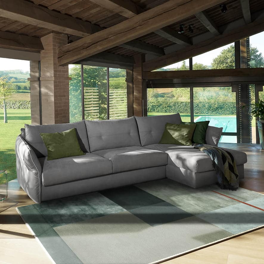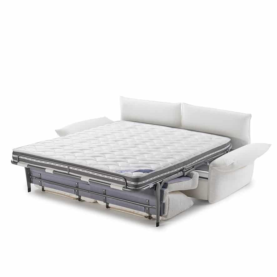 Apertura del divano in una sola rotazione che permette di conservare i cuscini di seduta e di schienale agganciati alla rete