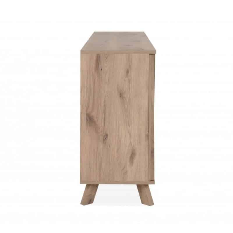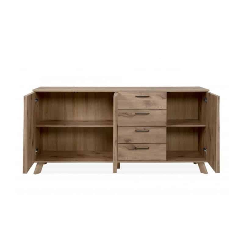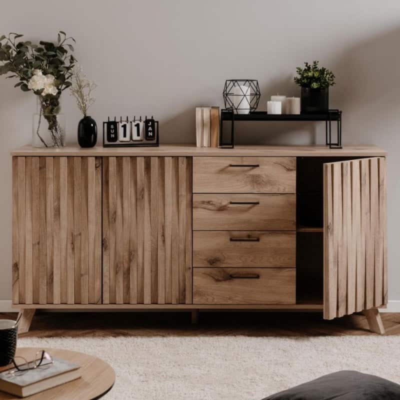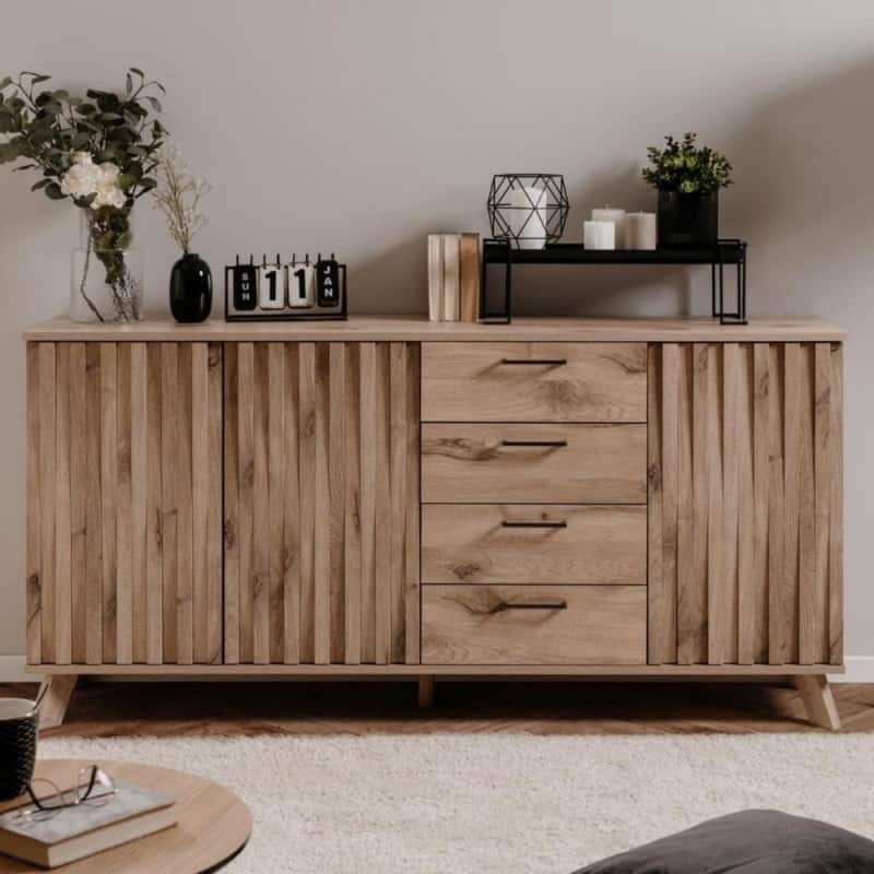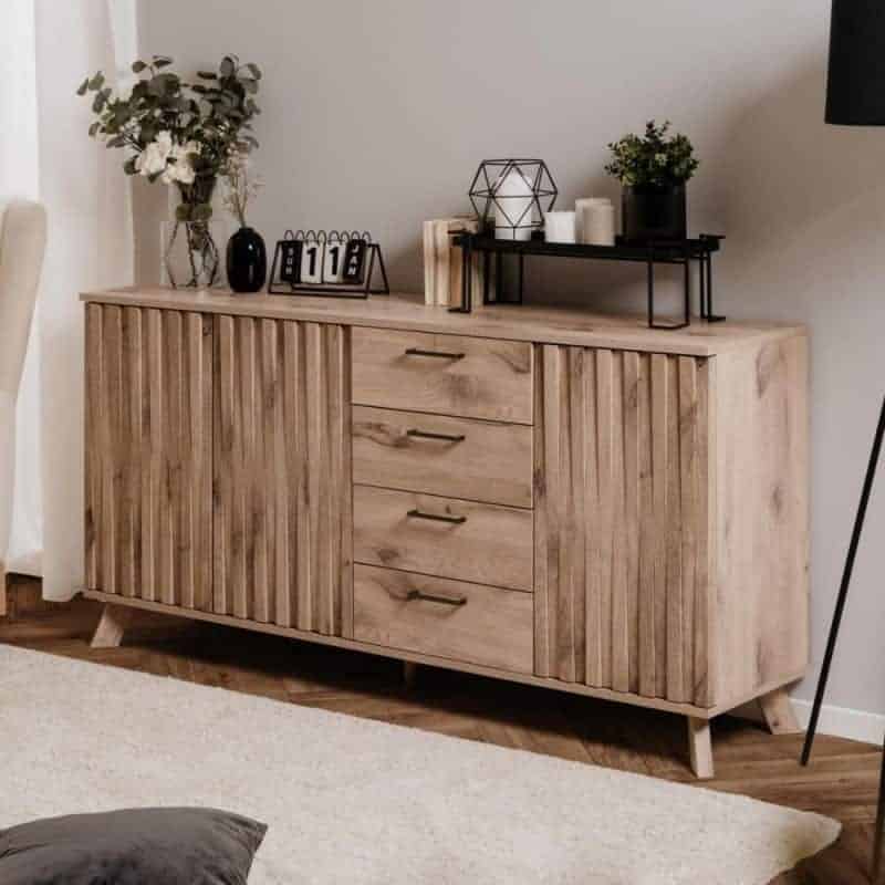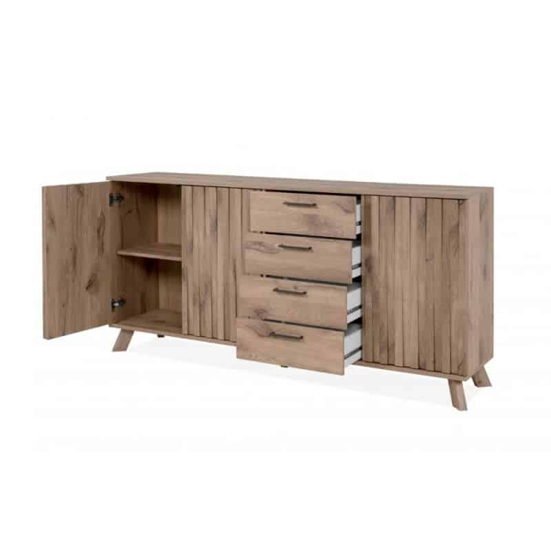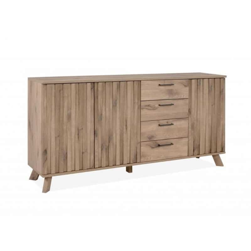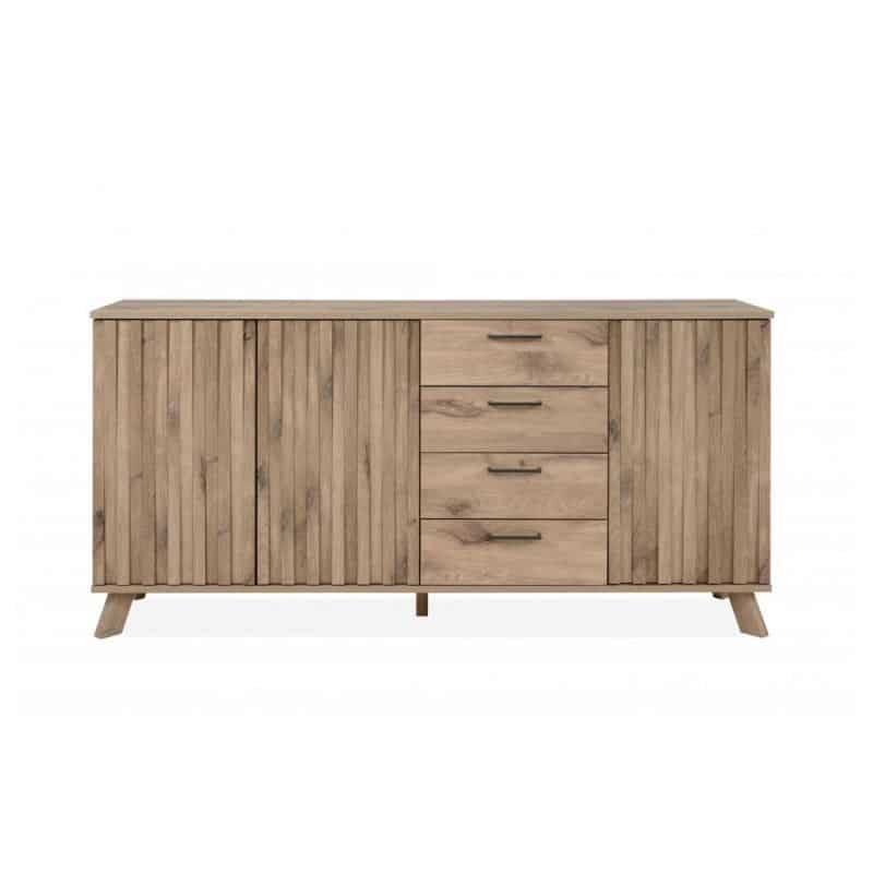Le sue particolarità? Lo stile scandinavo e l’ottima gestione degli spazi interni. La madia ha 3 ante divise da ripiano e 4 generosi cassetti. I frontali delle ante sono resi movimentati dalla presenza di listelli verticali.