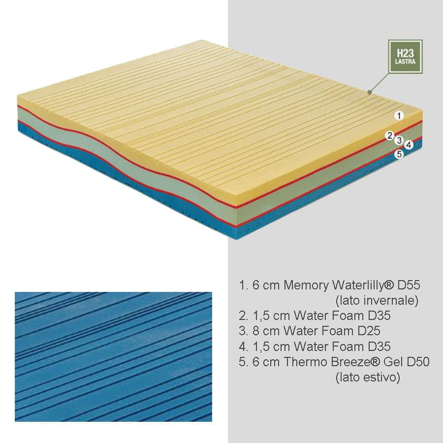 1. Strato in Memory Waterlilly® (lato invernale), a base d’acqua, che garantisce un comfort elevato grazie all’alta densità e un’elasticità che memorizza le forme del corpo, adattandovisi anche dopo svariati anni alleviando lo stress e le tensioni muscolari. Altamente traspirante, favorisce la circolazione dell’aria ed evita il ristagno di calore e di umidità.