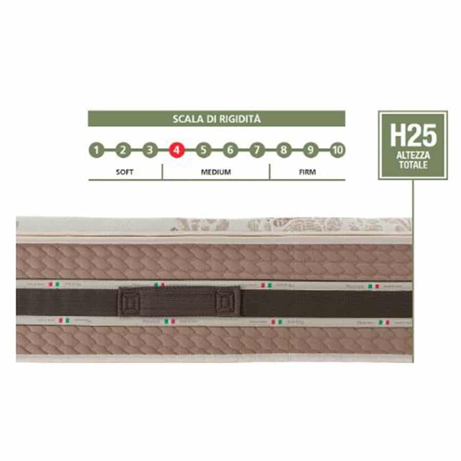 Il materasso è fabbricato in Italia, ha uno spessore totale di 25 cm e una rigidità in scala 4/10