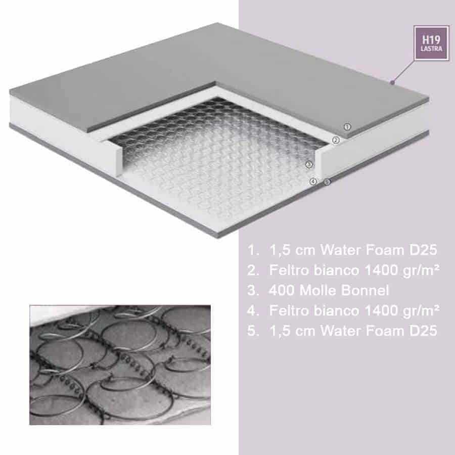 • uno strato superficiale (su entrambi i lati) in Water Foam sp. 1,5 cm D25, una schiuma ad alta densità a base di acqua e a cellule aperte, altamente traspirante e in grado di fornire un supporto ergonomico.