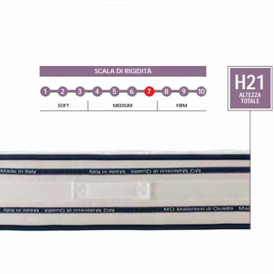 Il materasso è fabbricato in Italia, ha uno spessore totale di 21 cm e una rigidità in scala 7/10.
