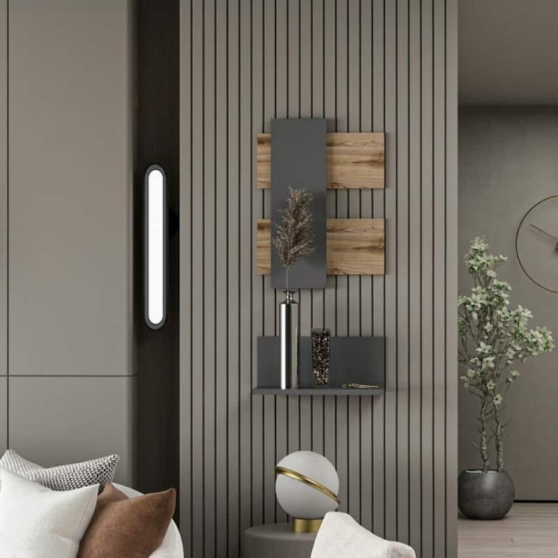 Raffinata composizione di pannelli e mensole nei colori antracite e noce che puoi usare per l’ingresso di casa, dello studio o su una parete del living.