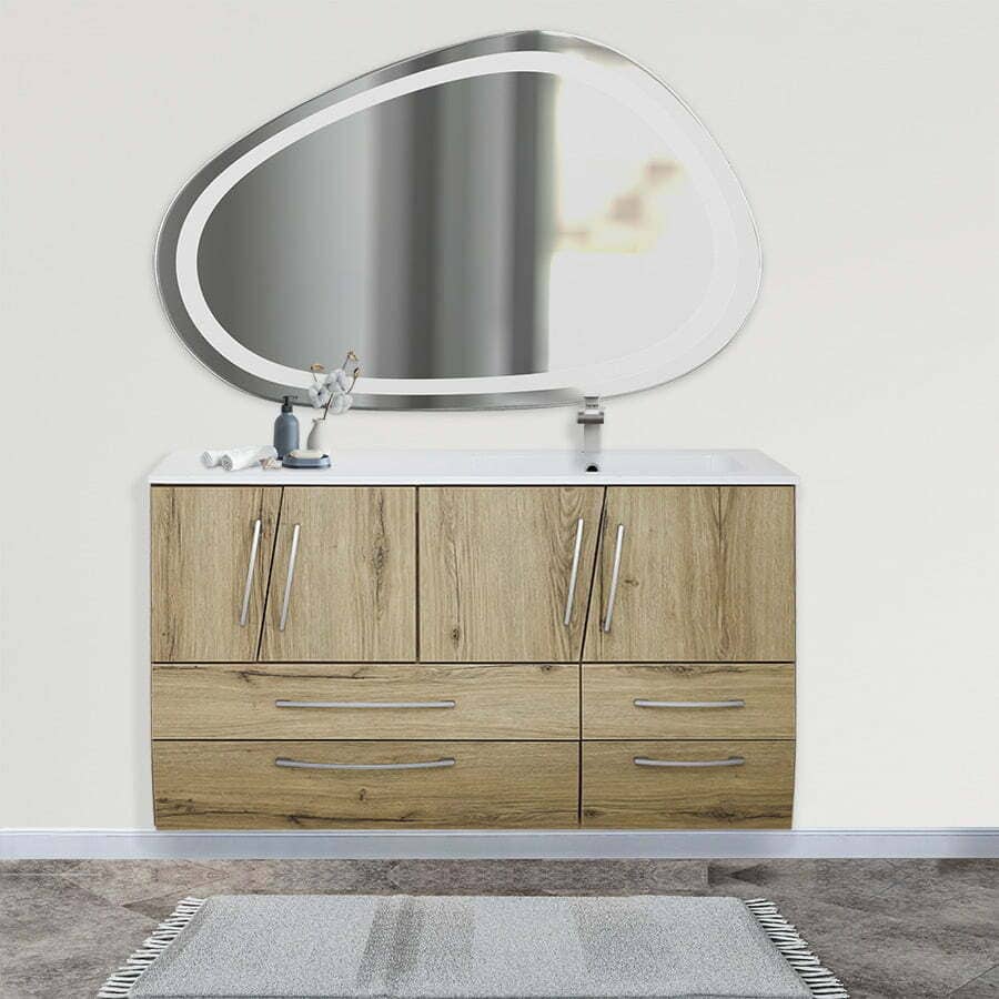 Mobile bagno sospeso con lavabo in ceramica a destra, ante e cassetti sagomati
