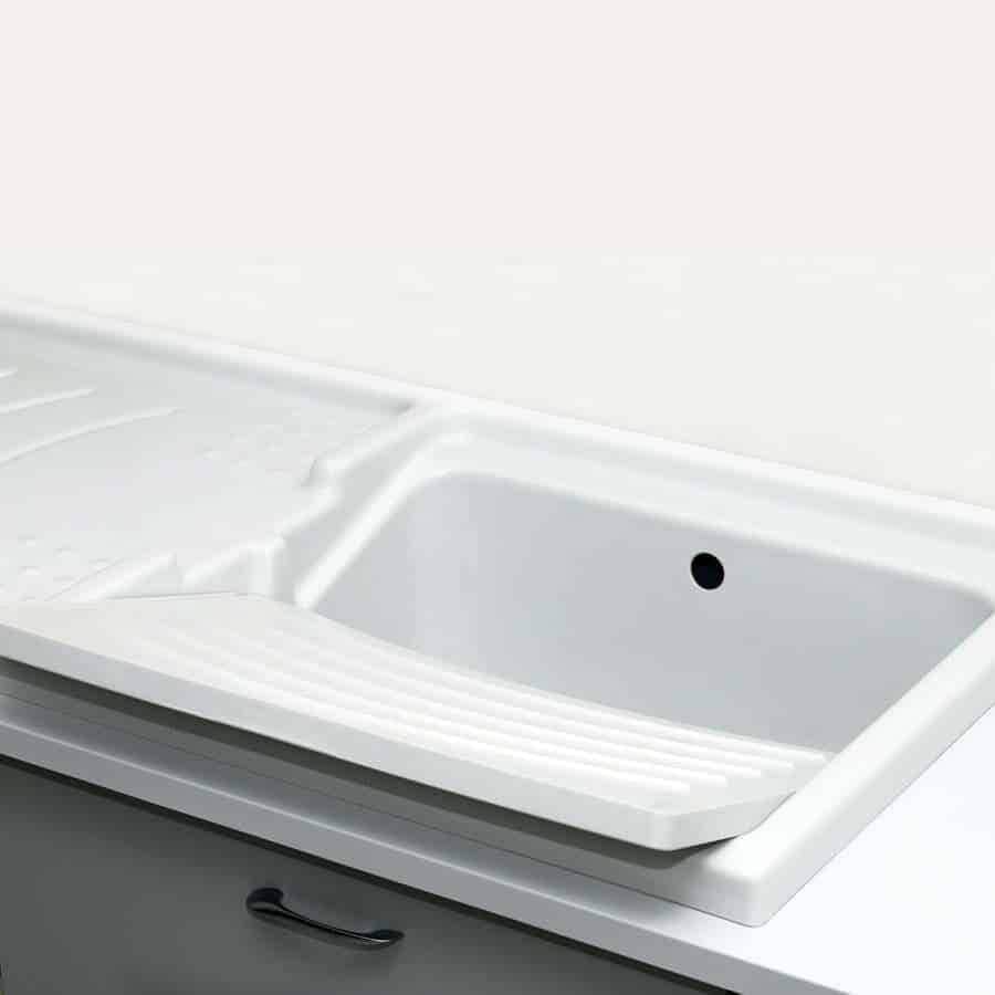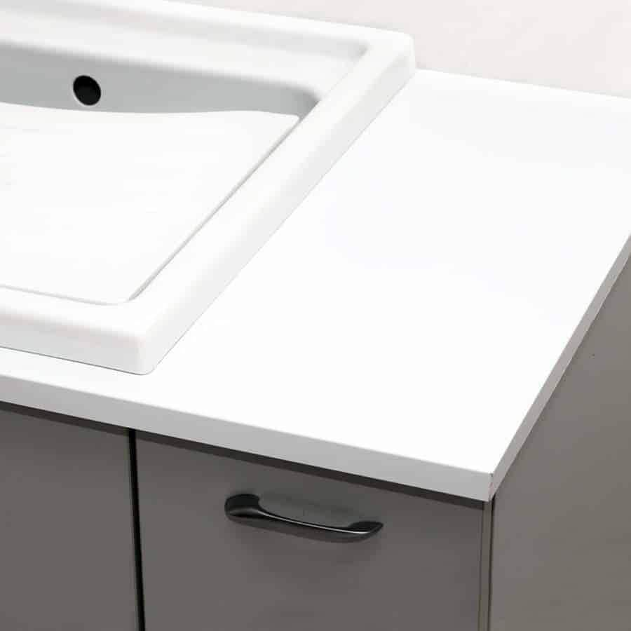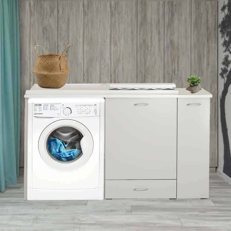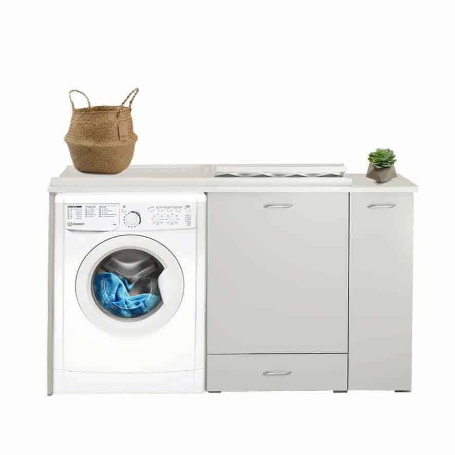 Il mobile ha dimensioni contenute e comprende anche un capiente lavabo in resina speciale lato destro e una doppia anta base con una mensola, dove potrai riporre il fustino del detersivo o altri prodotti da tenere a portata di mano in lavanderia.