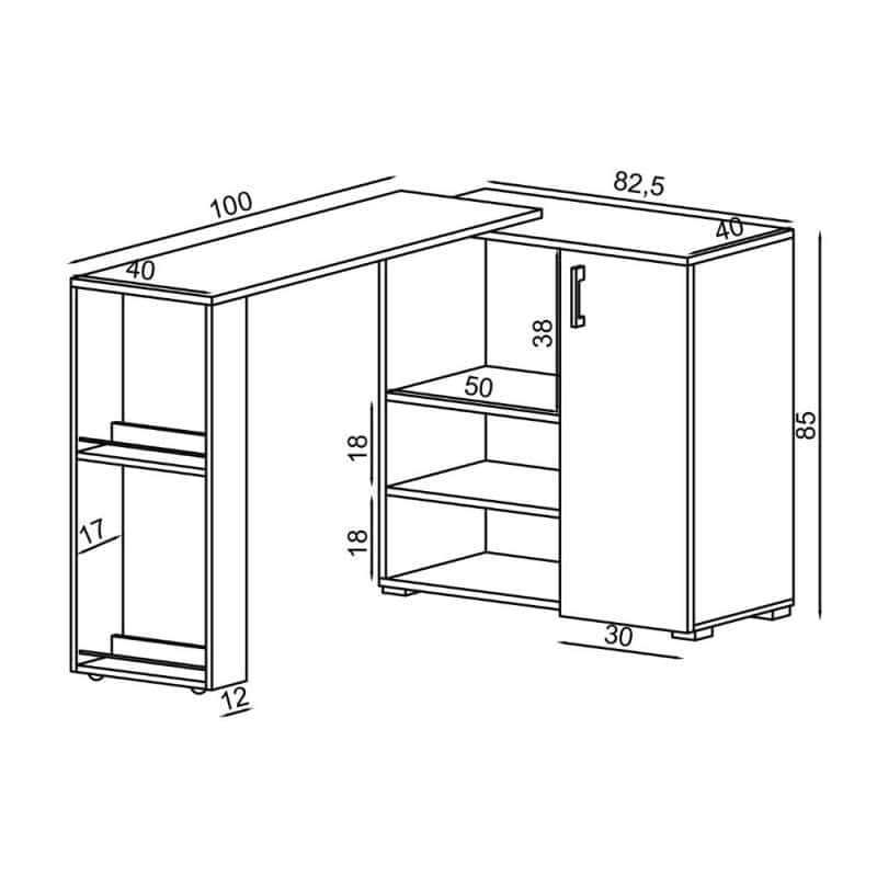 E’ un mobile che si compone di 3 vani a giorno, 2 ripiani interni chiusi da anta e una praticissima struttura a L che ruota su asse per ottenere un pratico tavolo da aprire all’occorrenza.