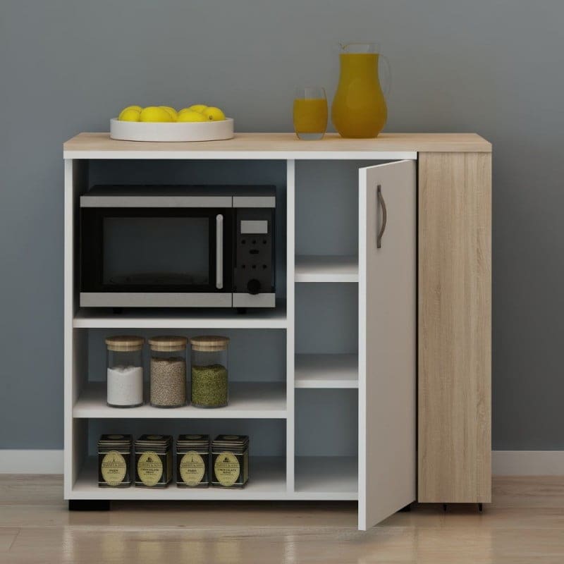 Dispone di 6 ripiani, 1 anta e tavolo richiudibile con ruote.
