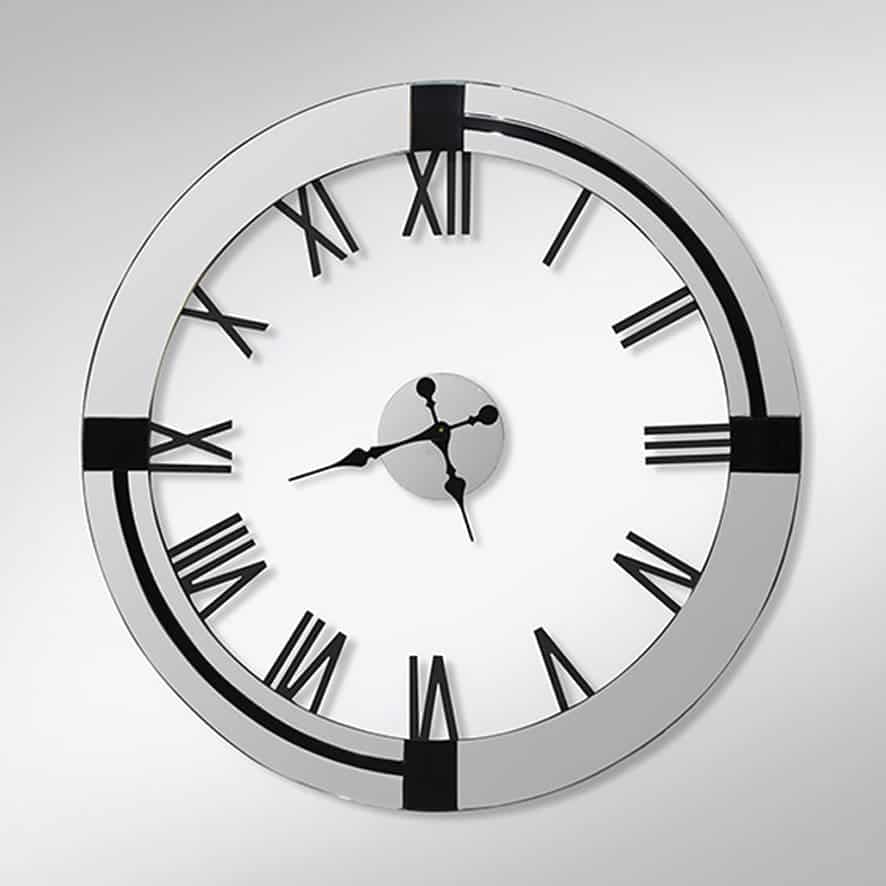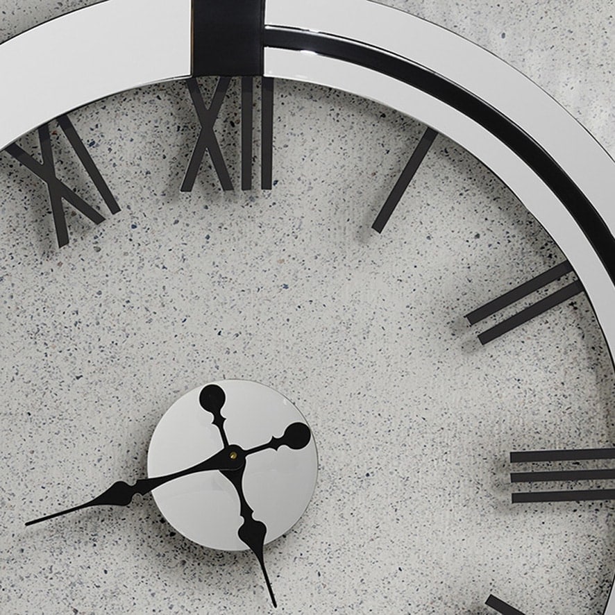 L’orologio Kairos è progettato con un anello di specchi smussati che circonda il quadrante, fornendo un effetto visivo sofisticato. La base dell’orologio è realizzata in MDF laccato, dall’aspetto elegante e moderno. I numeri e i dettagli decorativi dell’orologio sono evidenziati in un accattivante tono nero che aggiungono un tocco di contrasto e distinzione al suo design.
