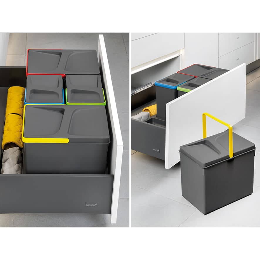 Le pattumiere per cassettone “Recycle” Emuca coniugano l’estetica accattivante con la loro praticità, pattumiere multiple, ovvero divise in due o in tre scomparti, ognuno dedicato a un particolare tipo di rifiuto.