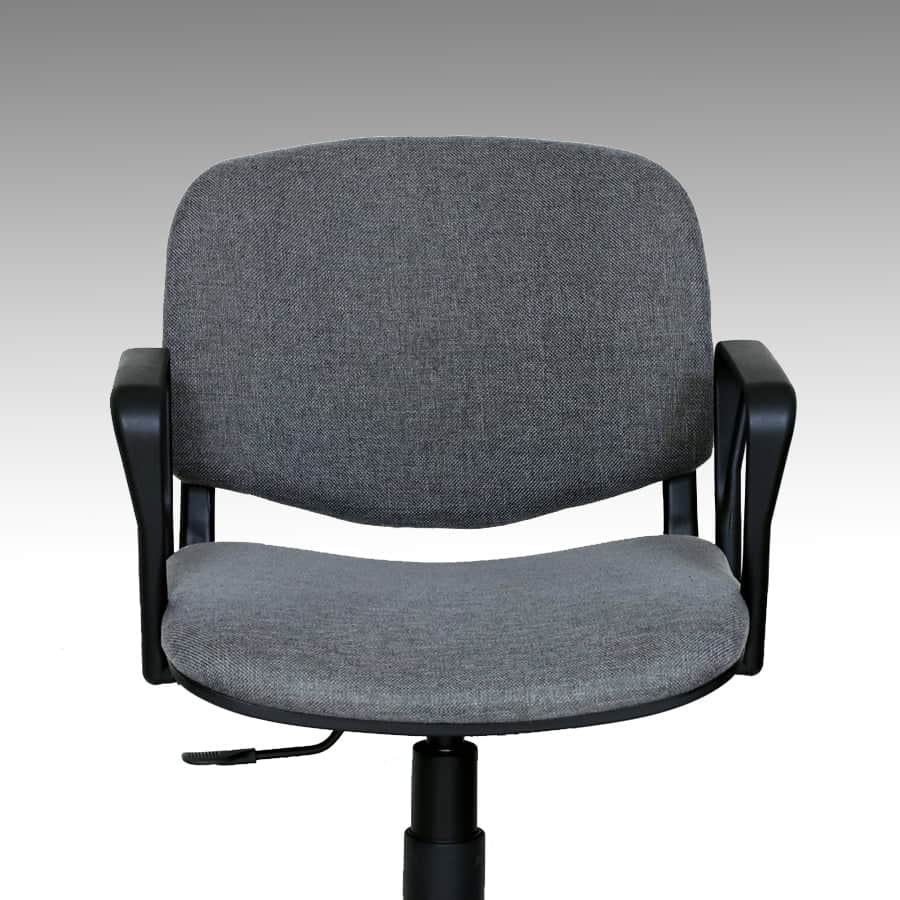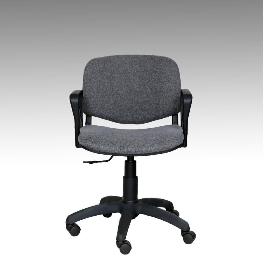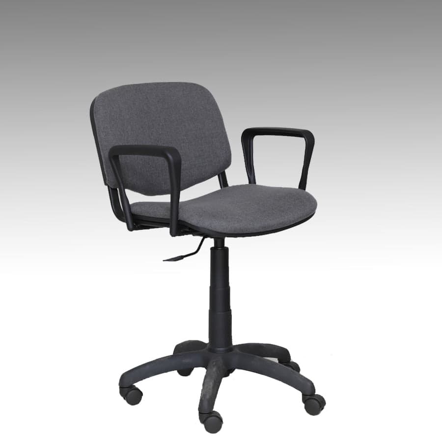 Poltrona da ufficio girevole “Venere” con schienale basso. Rivestita in tessuto grigio.