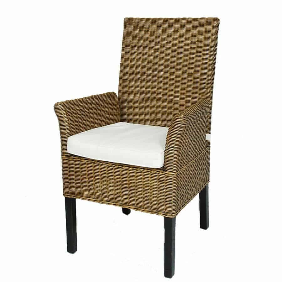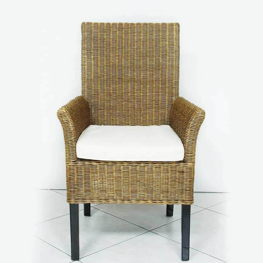 Poltrona midollino intrecciato con braccioli, schienale alto, gambe in teak e cuscino imbottito