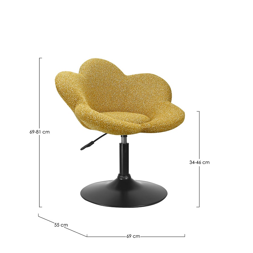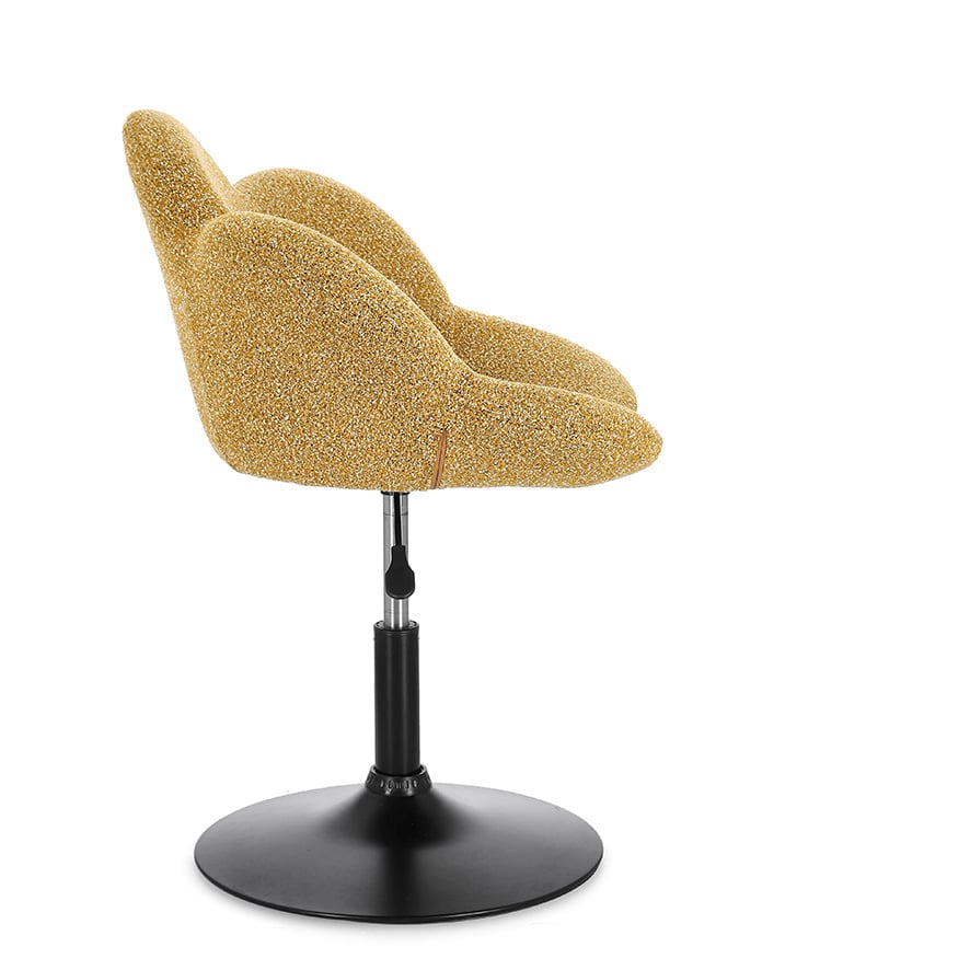 - Altezza Regolabile: La poltroncina Fleur è dotata di un sistema di regolazione in altezza, che consente di adattarla alle preferenze di ciascun utente. Questa funzionalità è particolarmente utile per chi desidera un utilizzo versatile, potendo facilmente passare da un angolo relax a una zona lavoro o studio.