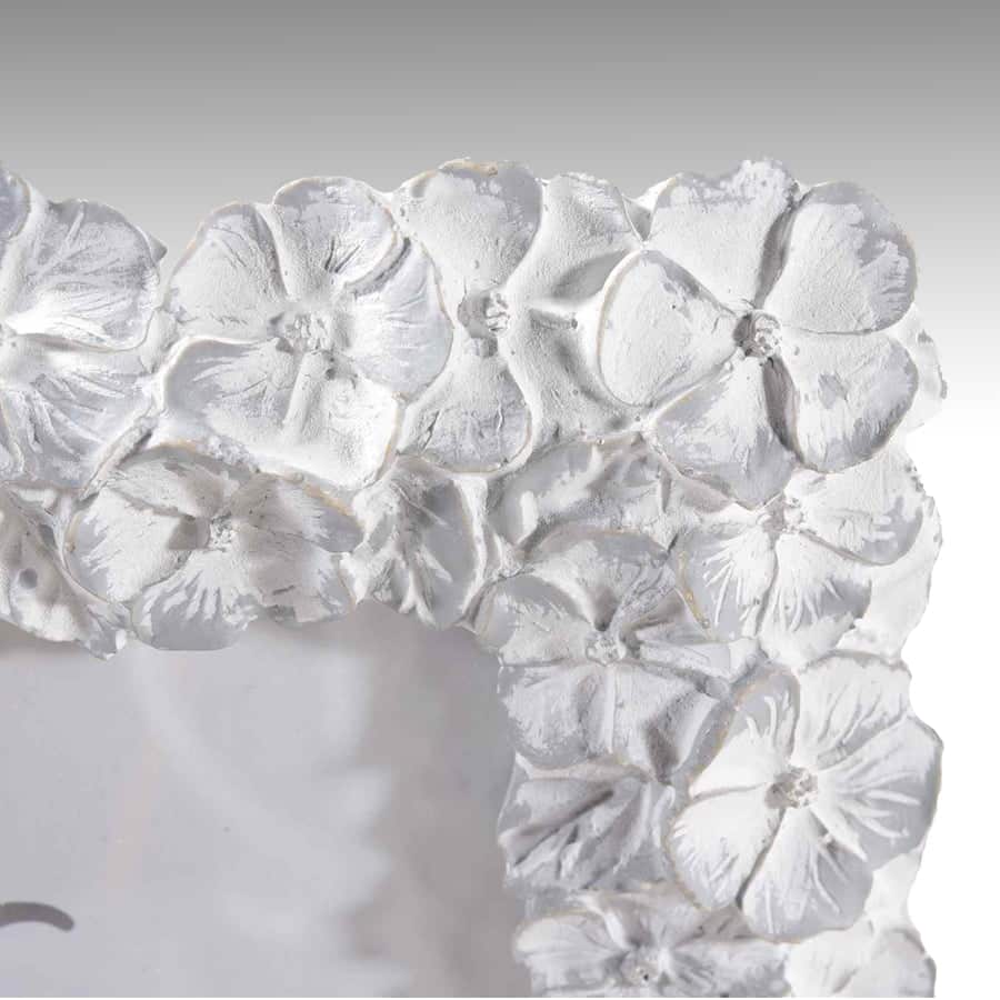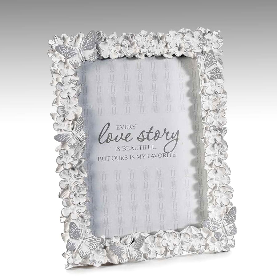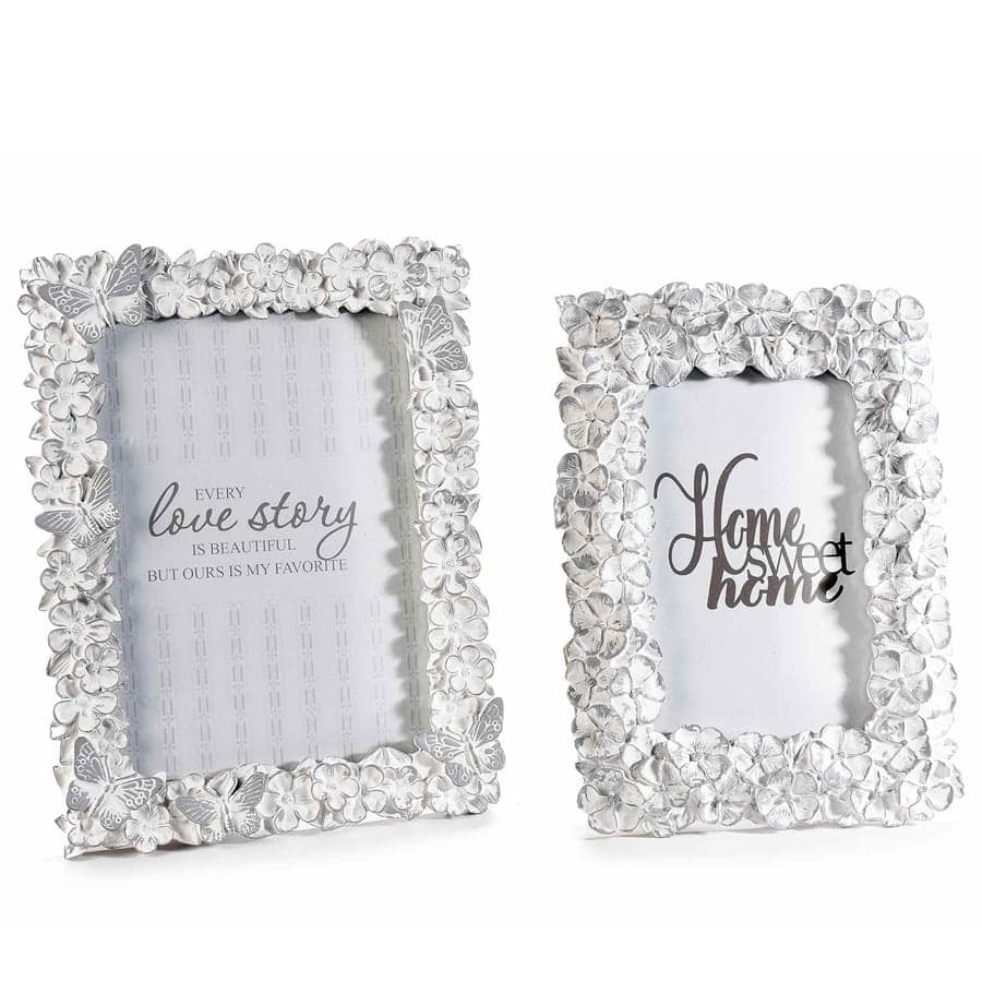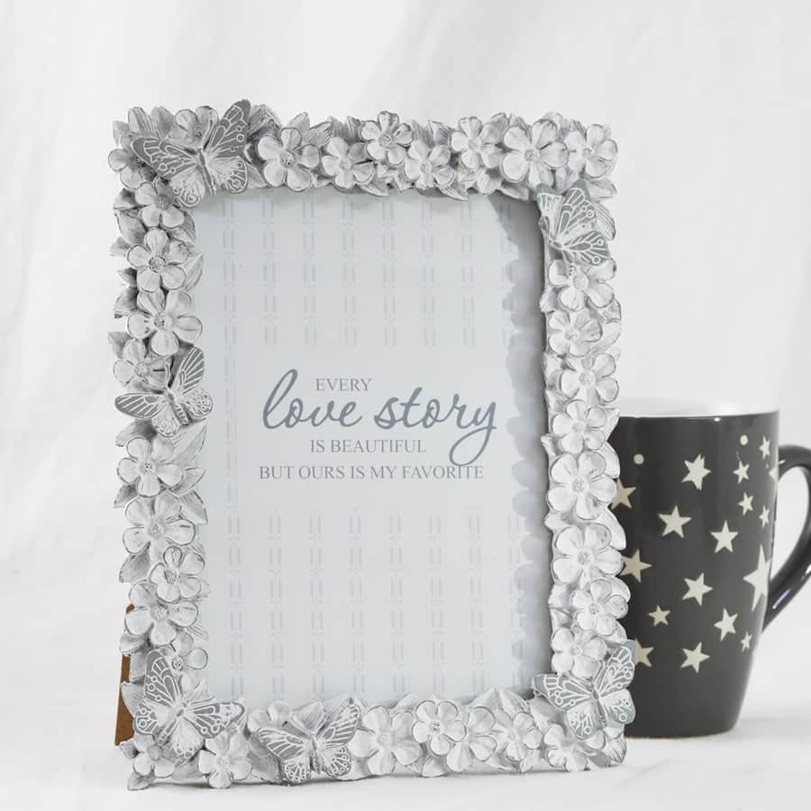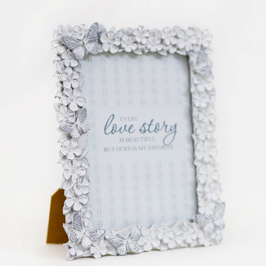Il raffinato effetto legno sbiancato e ricami floreali donano un tocco country alle cornici decorate con fiori e farfalle in rilievo.