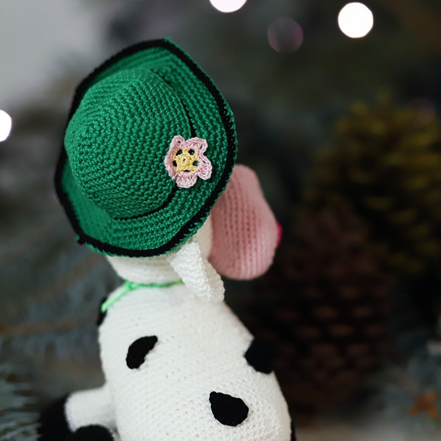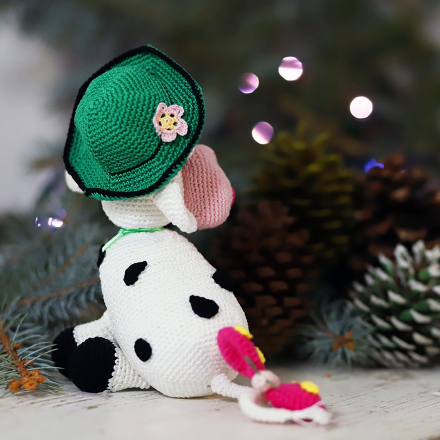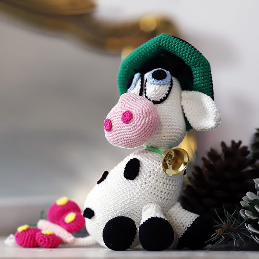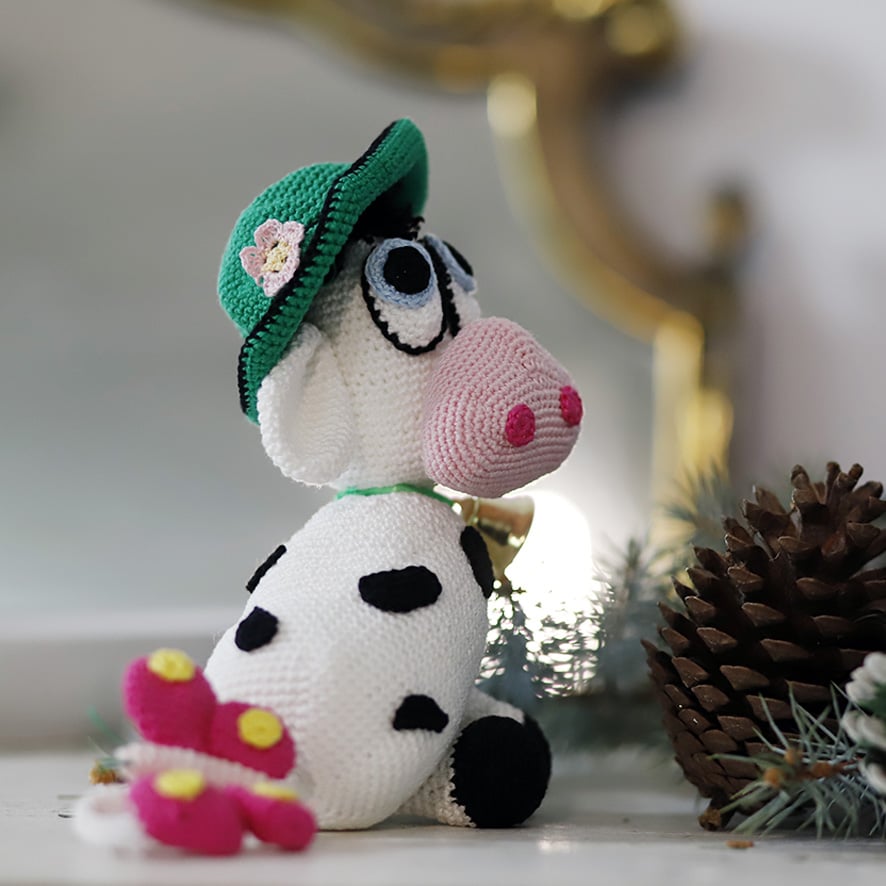 • Dettagli: La mucca presenta un grazioso muso rosa con guance rotonde, macchie nere caratteristiche, un simpatico cappello verde con fiorellino. Completa l’aspetto una campanella dorata e una piccola farfalla rosa attaccata alla coda per un tocco giocoso.