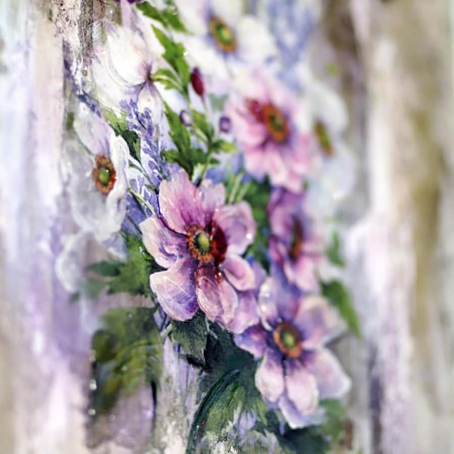 Questa creazione è un perfetto equilibrio tra arte e decorazione. Al centro, un decoupage di bouquet di fiori dai toni delicati – rosa, lilla, azzurro e bianco – con riempimenti visivi dipinti ad acquerello, si fonde armoniosamente con lo sfondo realizzato in acquerellatura su texture materica. Le superfici sono arricchite da effetti craquelé, sfumature vintage e una patina invecchiata che conferisce carattere e profondità all’opera.