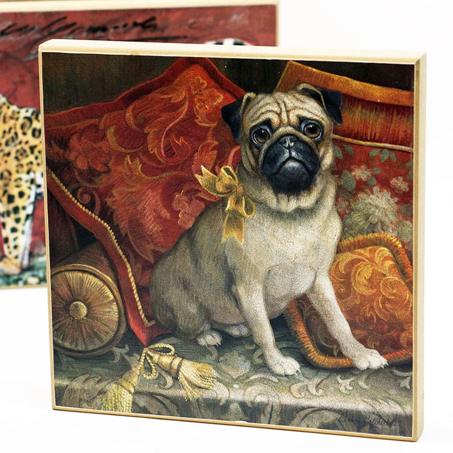 Quadro in legno con stampa di un cane di razza Carlino, in stile country francese. Assume un’aria aristocratica nel suo insieme.