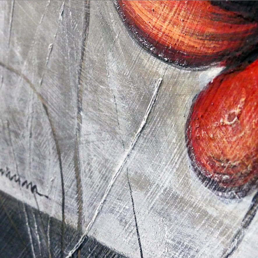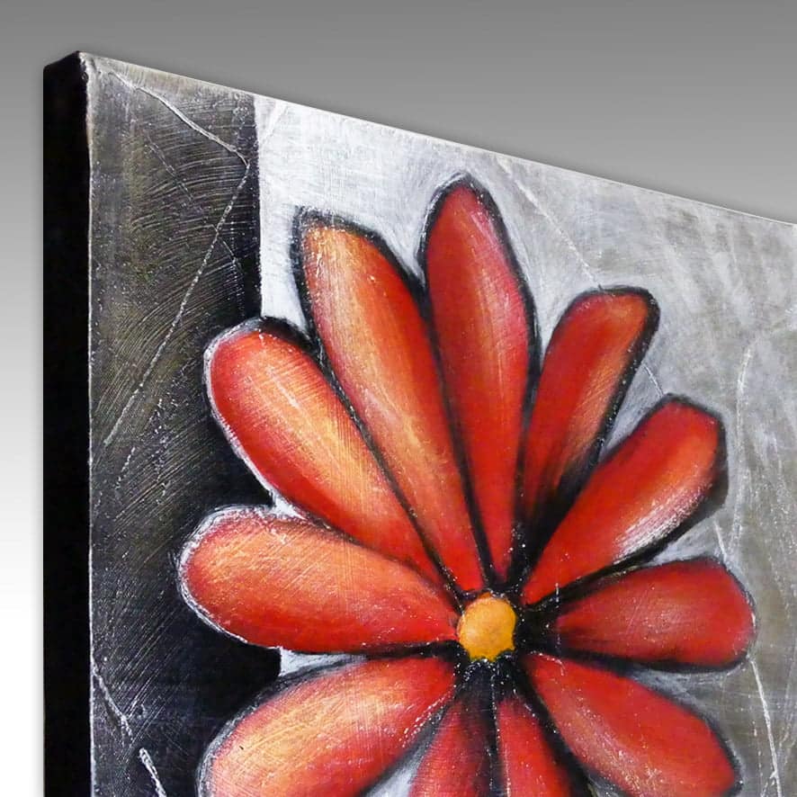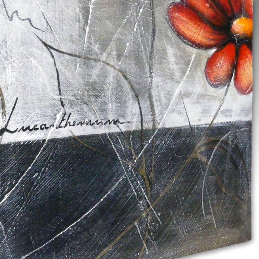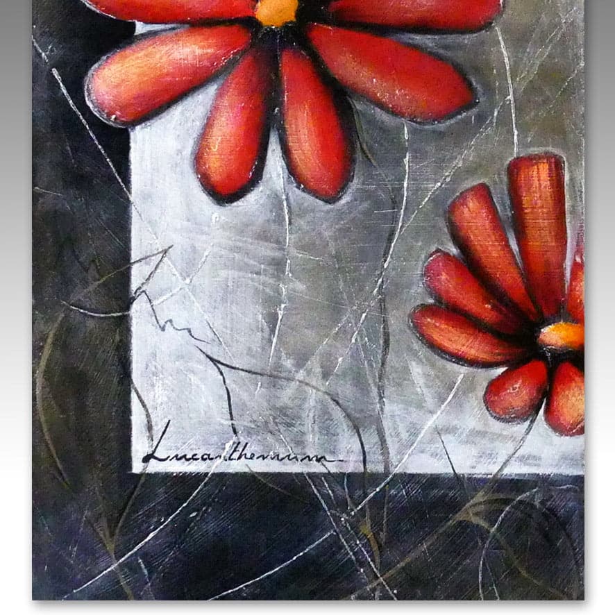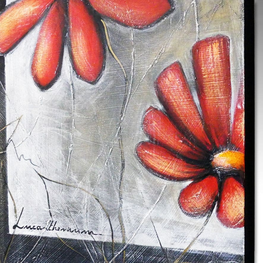 Il dipinto raffigura 2 vibranti fiori rossi su una tela dai toni chiari con una cornice dal colore nero dipinta lateralmente. I fiori sono distribuiti in modo armonioso al centro della composizione, con petali che si aprono in una varietà di sfumature rosse, dal cremisi al rosso scuro.