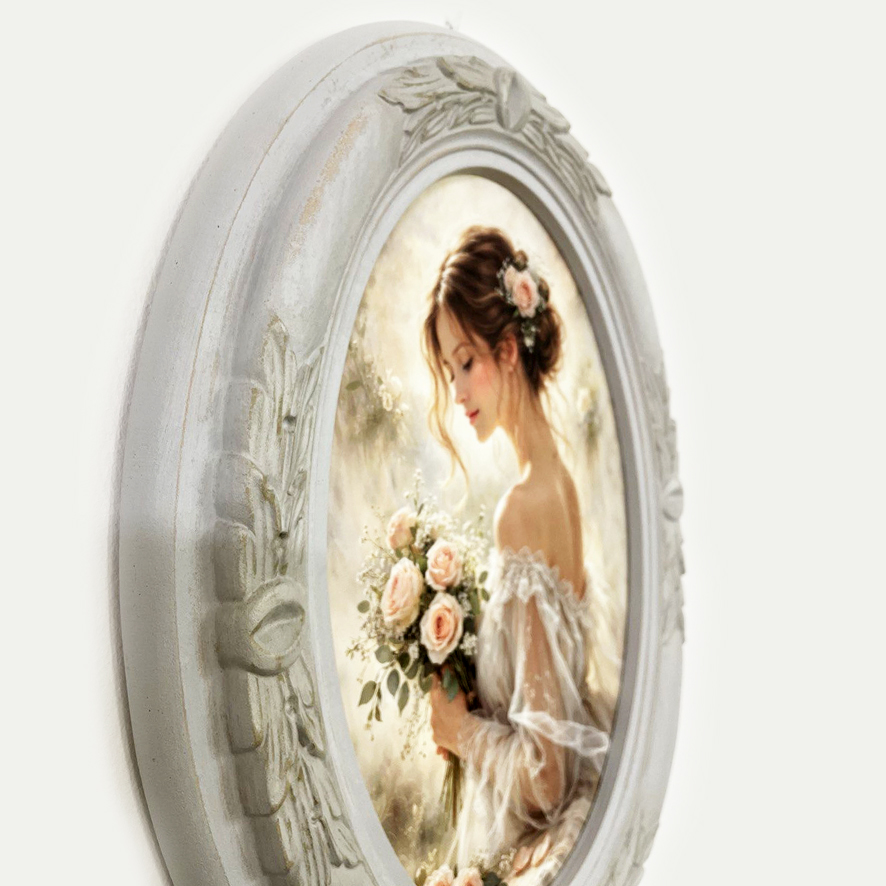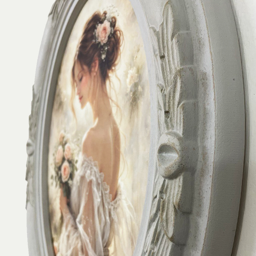 La cornice ovale, con finitura grigio inglese anticato e dettagli floreali in rilievo, completa l’opera rendendola perfetta come decorazione per ambienti eleganti e accoglienti.