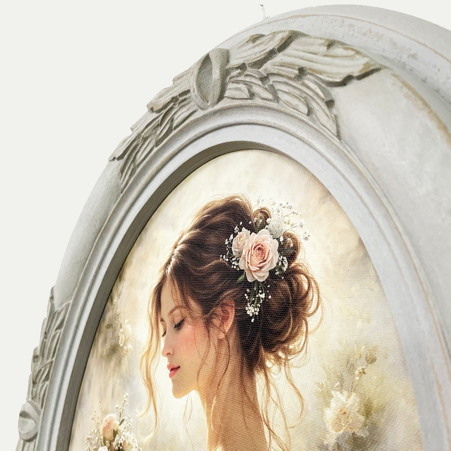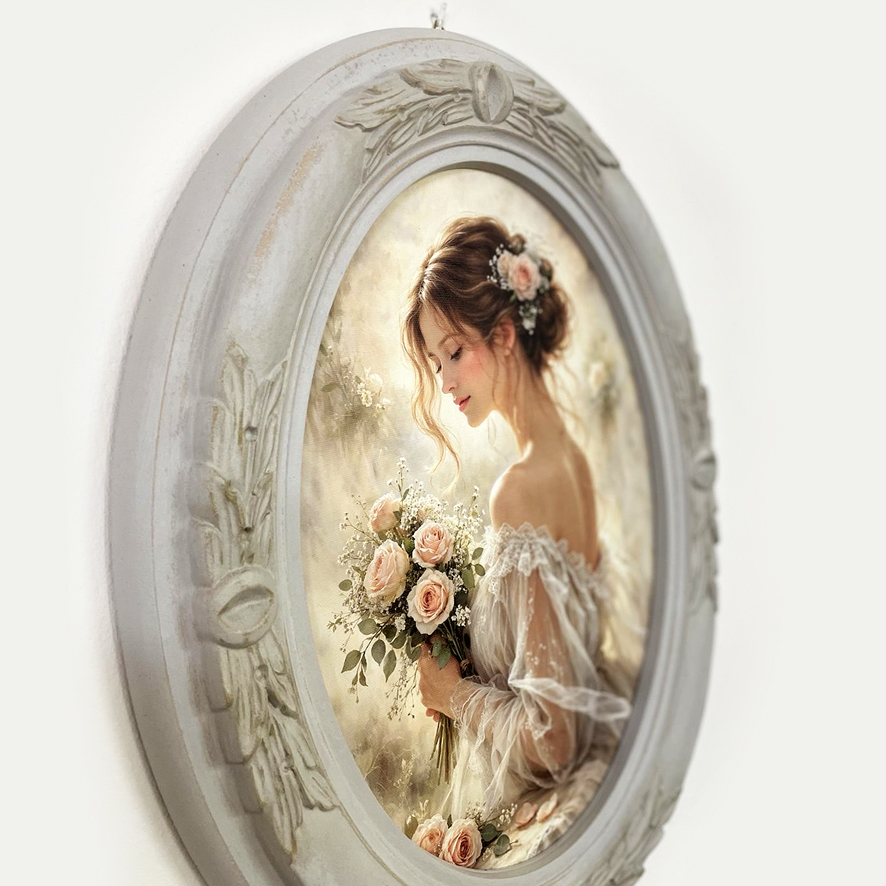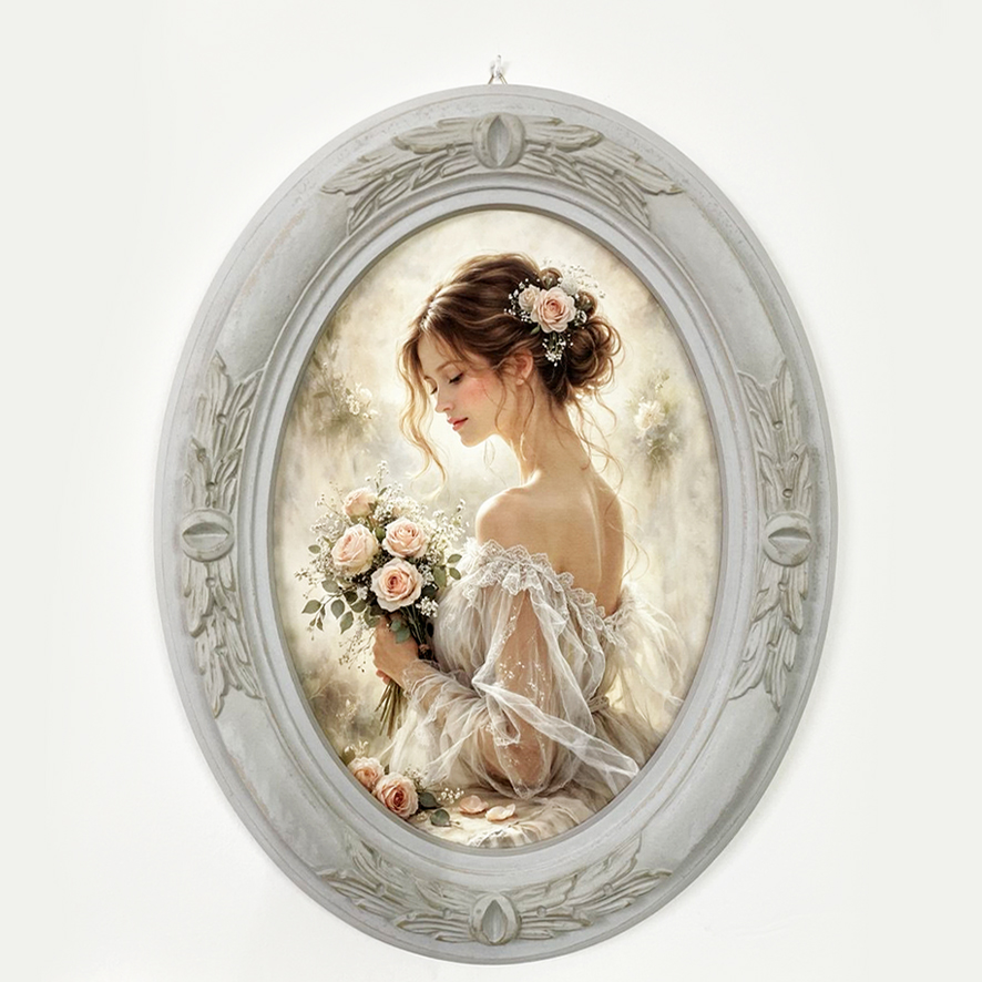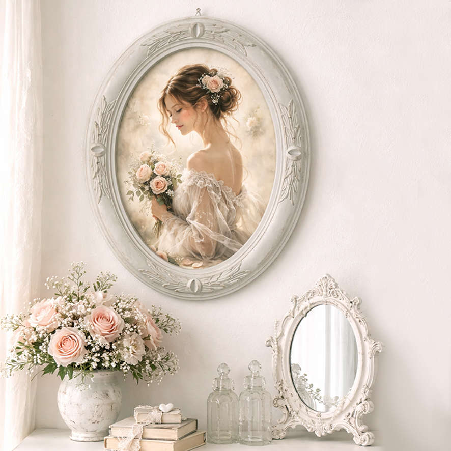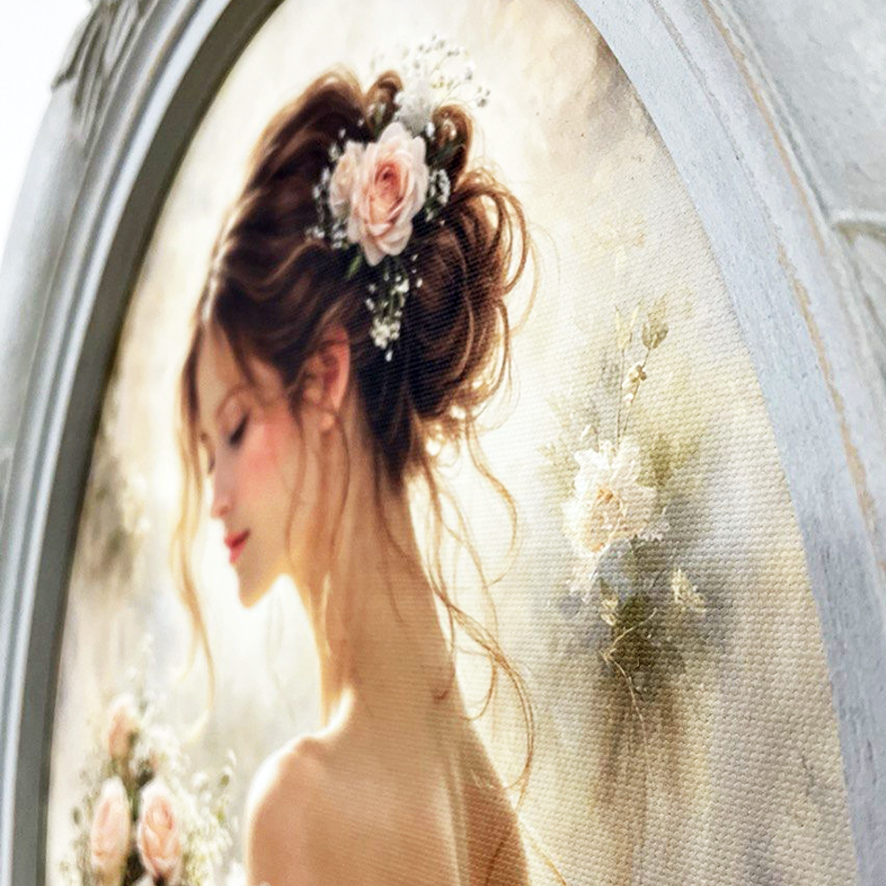 La stampa su tela raffigura un raffinato ritratto femminile dai toni cipria e pastello, impreziosito da rose, perfetto per creare un’atmosfera romantica e senza tempo.