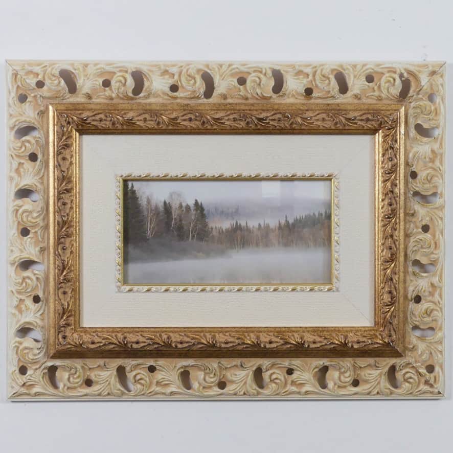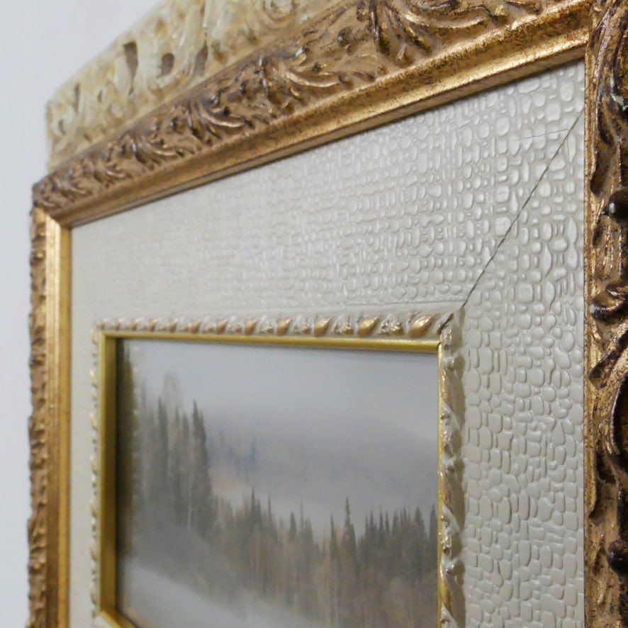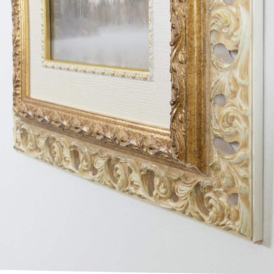 Quadro “Winter” con cornice traforata, passpartout in legno bucciardato e filo oro lavorato