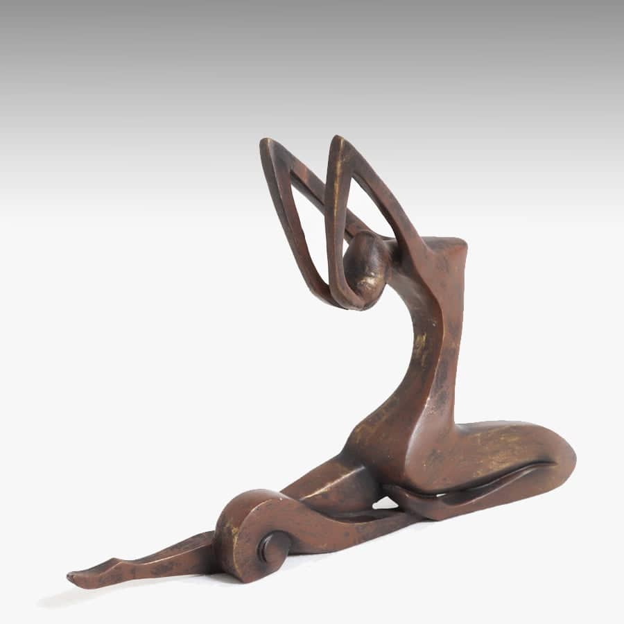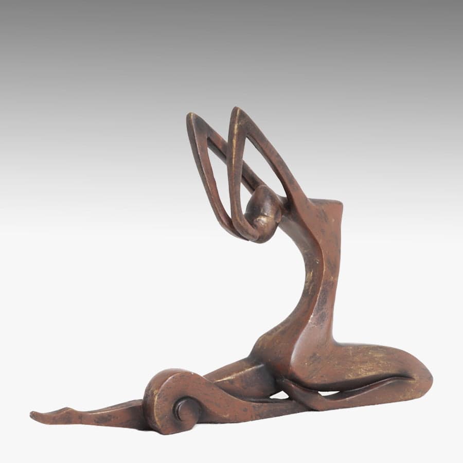 Elegante scultura in metallo bronzato Lady Stretch in stile contemporaneo.