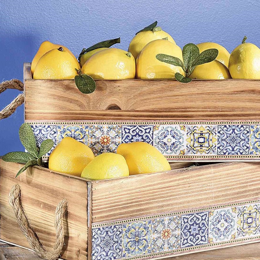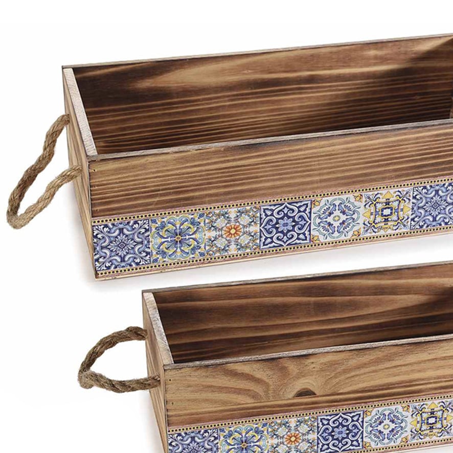 Aggiungi un tocco di tradizione e charme rustico alla tua casa con l’ incantevole set di 2 cassette in legno, dotate di eleganti manici in corda e decorazioni ispirate allo stile “Maiolica”.