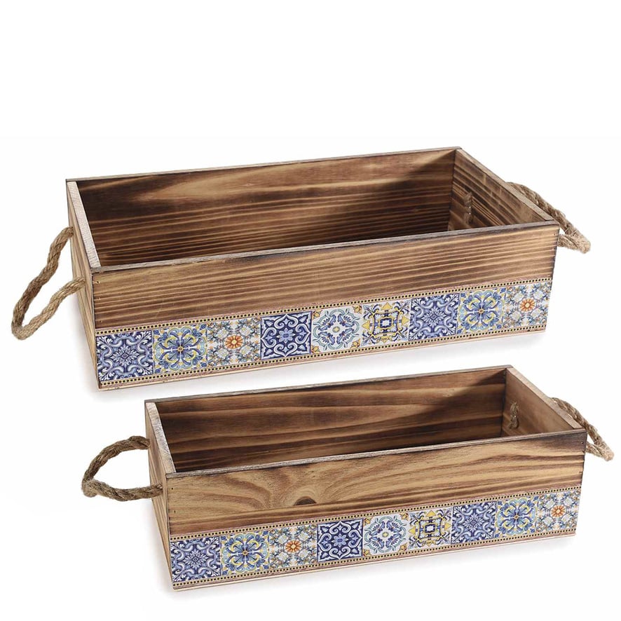 Set 2 cassette in legno manici in corda, decori “Maiolica”