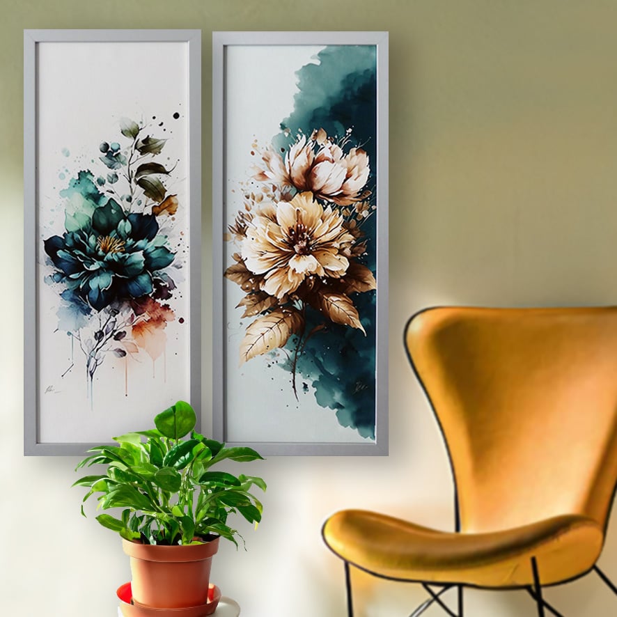 Il set 2 quadri floreali su tela è realizzato per creare un senso di continuità e coerenza visiva. I due quadri, pur essendo separati, formano insieme una composizione armonica continuativa e allo stesso tempo contrastante. I colori sono coordinati, e i soggetti floreali sono presentati in modo che si completano a vicenda nell’accostamento dei colori e composizione visiva.