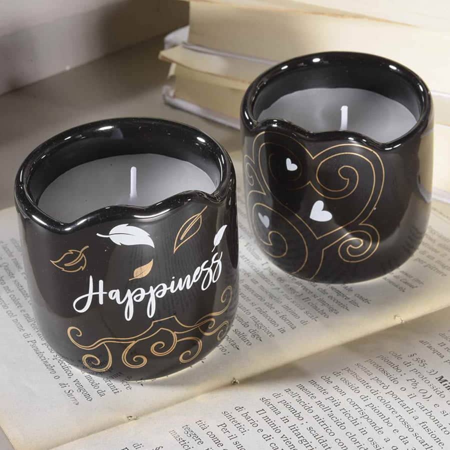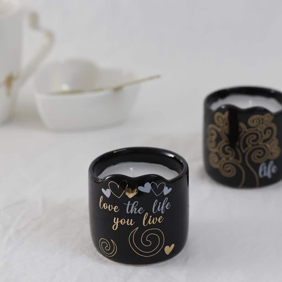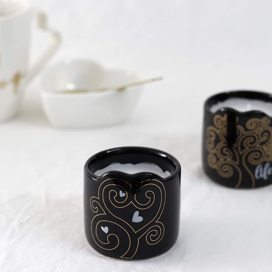 Il set 3 candele in vasetto ceramica nero e decori colore oro Albero della vita coniuga profumi e auguri