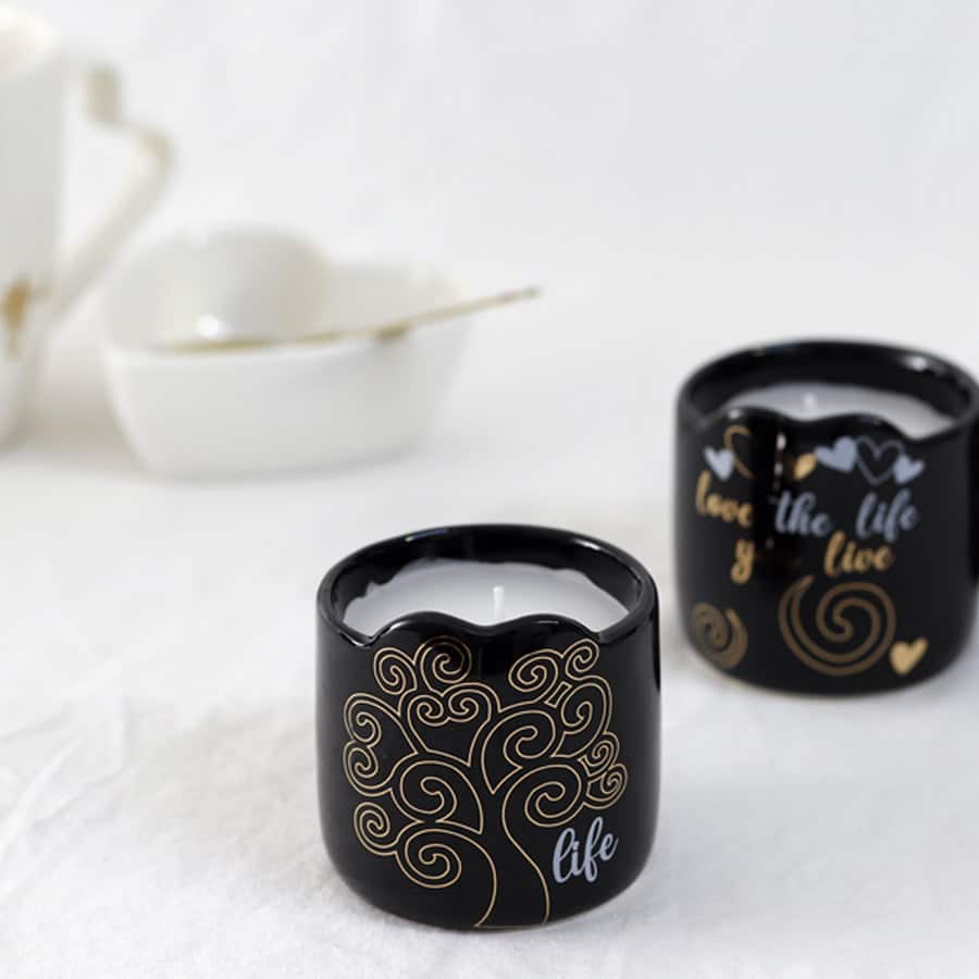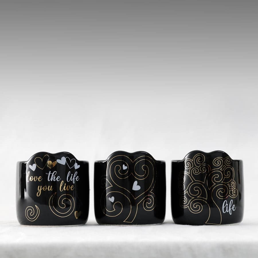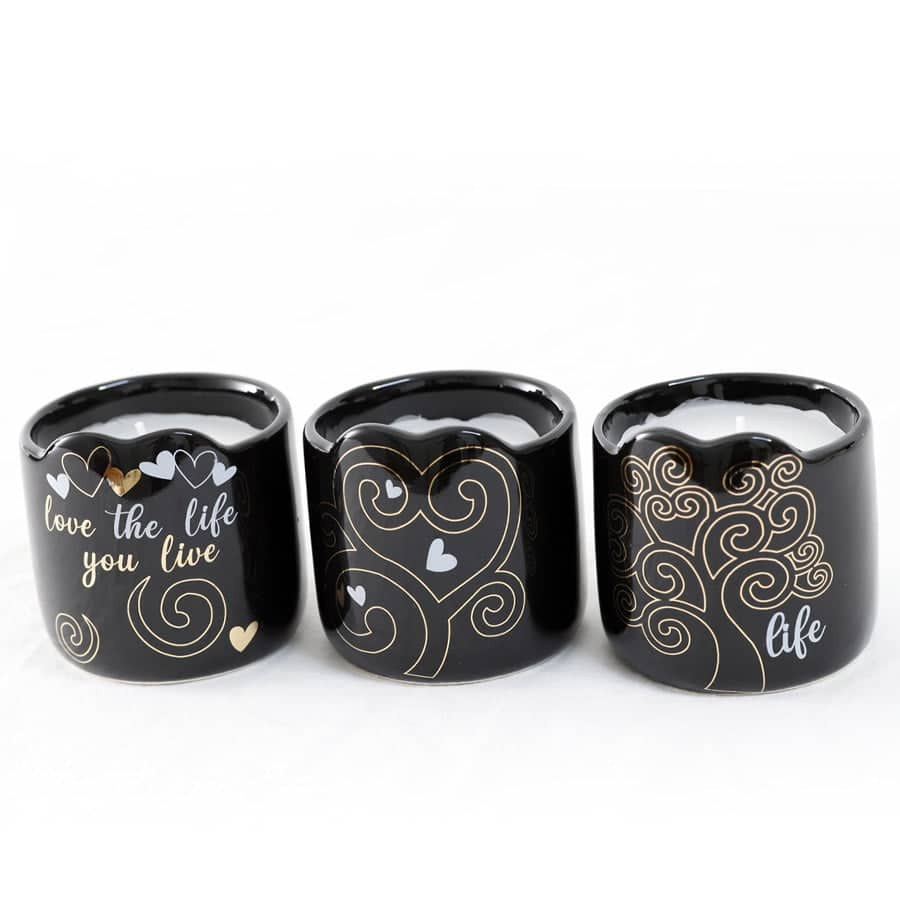Set 3 candele in vasetto ceramica nero e decori colore oro Albero della vita