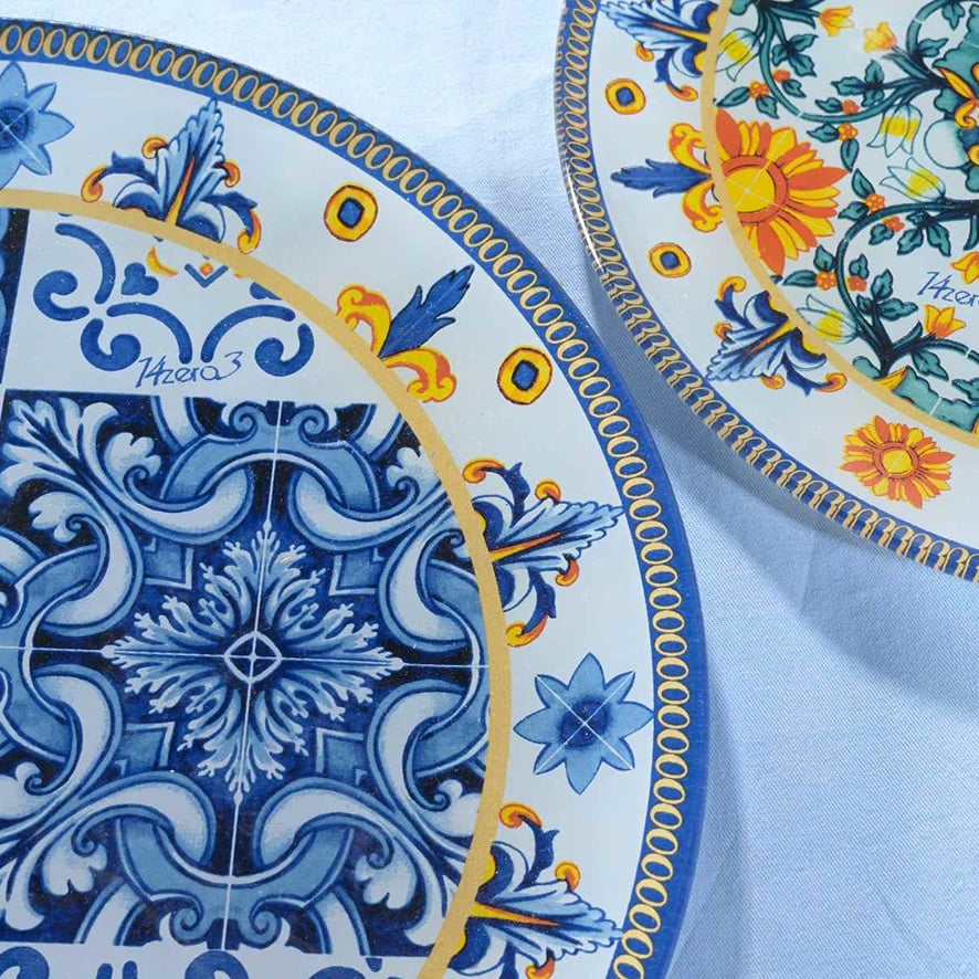 Ogni piatto è un’opera d’arte unica, lavorata con maestria artigianale e decorata con il classico stile della maiolica.
