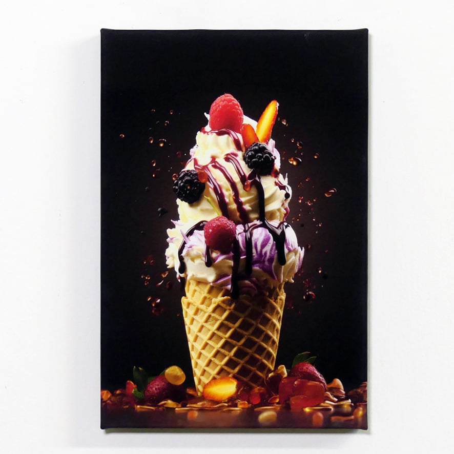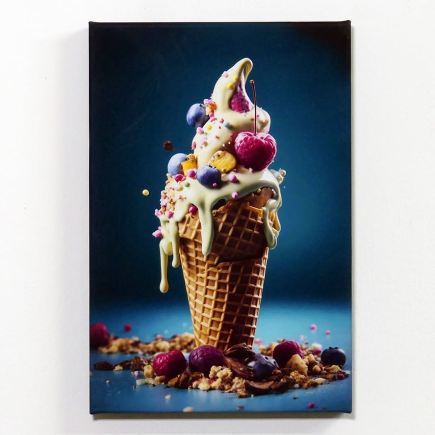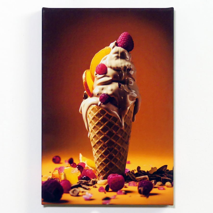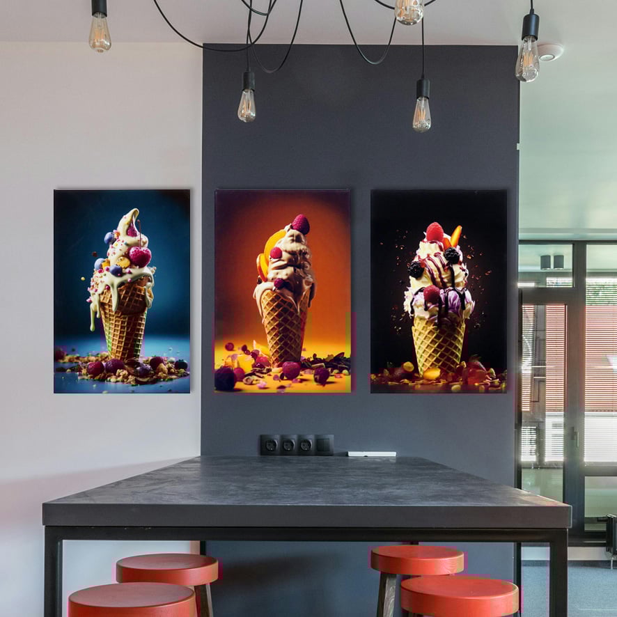 Ogni singola tela è un viaggio verso un luogo familiare eppure sorprendente, un luogo dove i sogni si mescolano con la realtà e le emozioni sono dipinte con colori squisiti. La tela col gelato dai toni pastello fa desiderare il fresco abbraccio dell’estate, mentre i gelati dai colori audaci sprigionano un senso di avventura e scoperta.