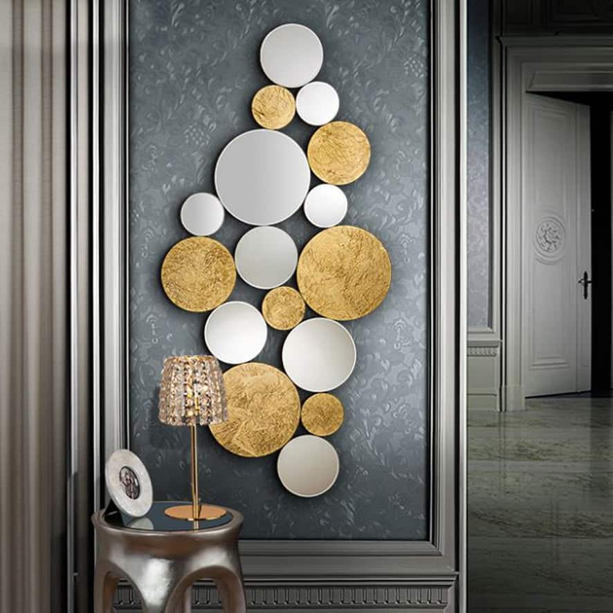 Specchio Cirze formato da superfici circolari di vetro bisellato e a fondo in lamina d’oro.