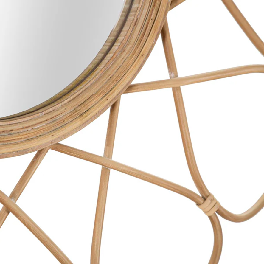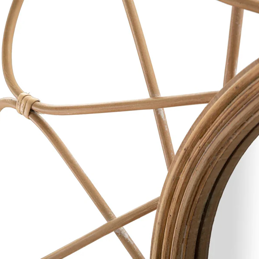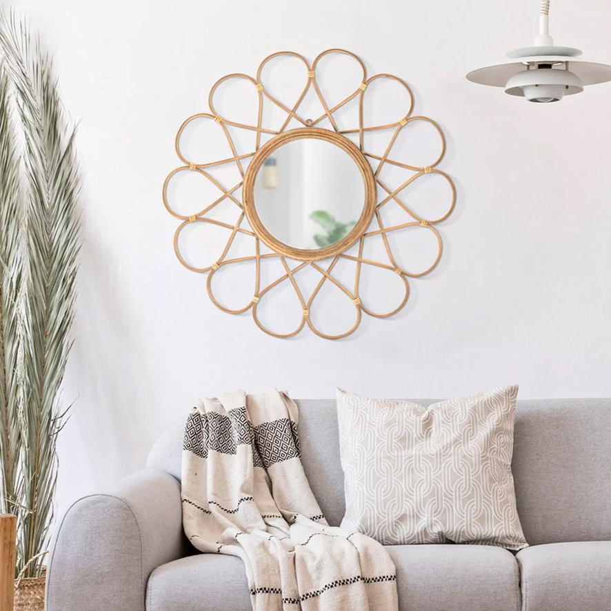 Lo specchio da parete Almeria unisce funzionalità e stile, con la sua cornice in rattan intrecciato a forma di petali che richiama la bellezza della natura.