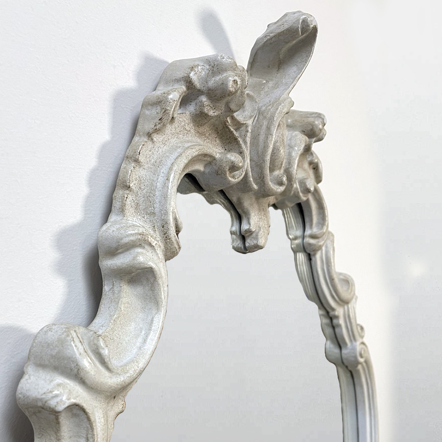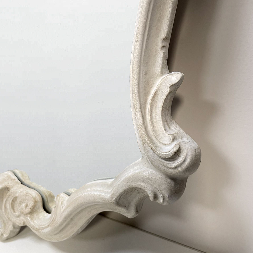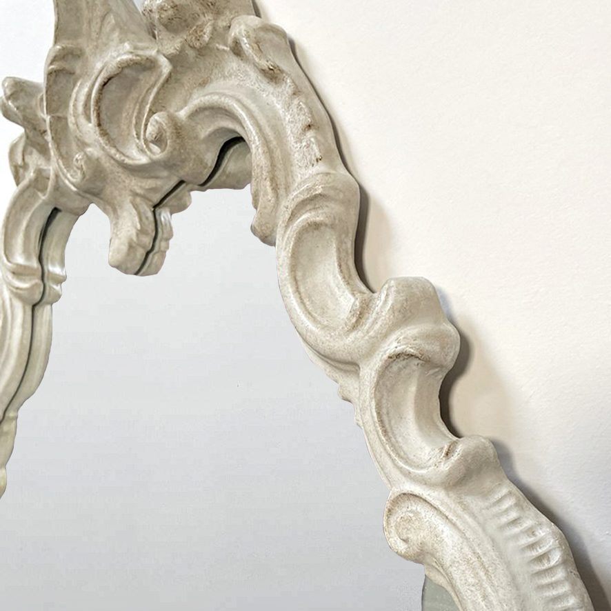 Splendido specchio da parete in stile rococò, caratterizzato da una raffinata cornice riccamente lavorata con motivi floreali e volute ornamentali.