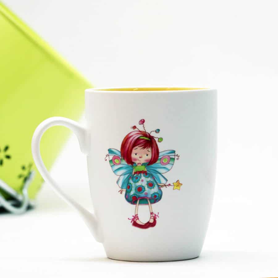 Simpatica tazza mug in ceramica con decoro fatina, interno giallo arancio.