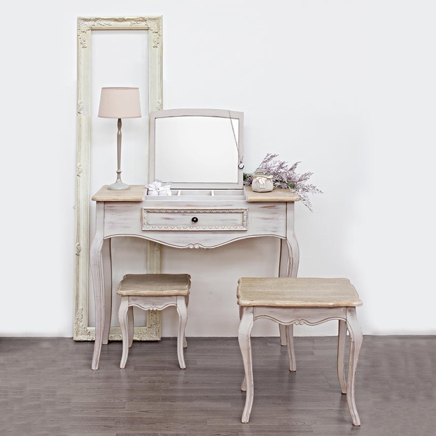 Il grande specchio, con la sua cornice decapata, riflette non solo l’immagine, ma anche i sogni e i pensieri di chi vi si specchia. Sul ripiano, magari adornato da una vecchia spazzola in argento e una bottiglia di profumo dalle linee retrò, ogni oggetto trova il suo posto, contribuendo a creare un angolo di intimità e bellezza.