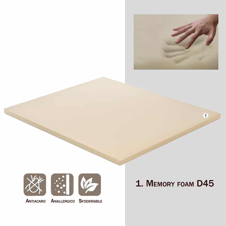 1. Strato in Memory Visco, schiuma termoregolare e viscoelastica, che contrasta la percezione di eccessivo calore e permette al materasso di adattarsi perfettamente alle forme del corpo diminuendo i punti di pressione.