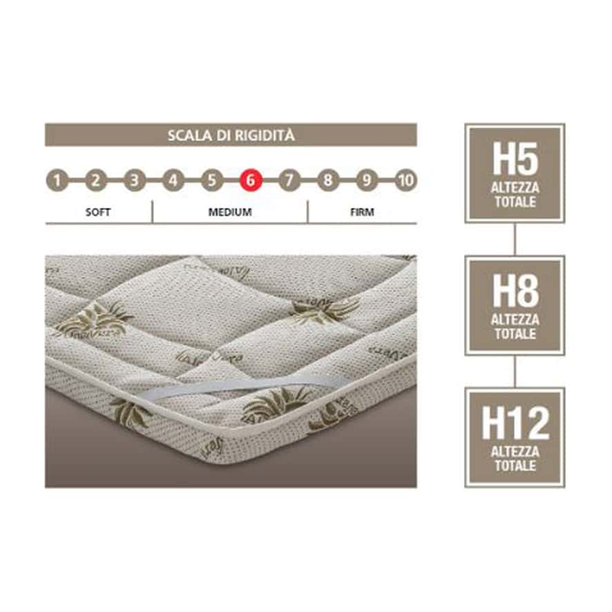La fodera a rivestimento fisso è in cotone imbottito con fibre in Aloe Vera, tessuto rigenerante e emolliente, che aumenta il livello di energia e migliora il benessere complessivo.