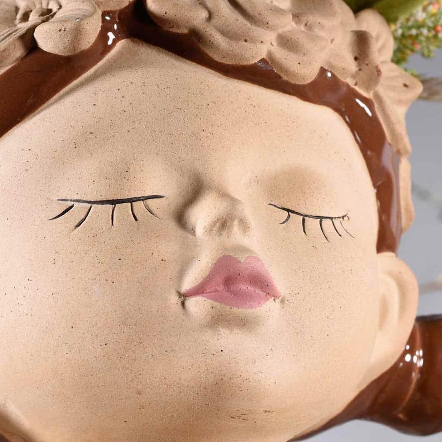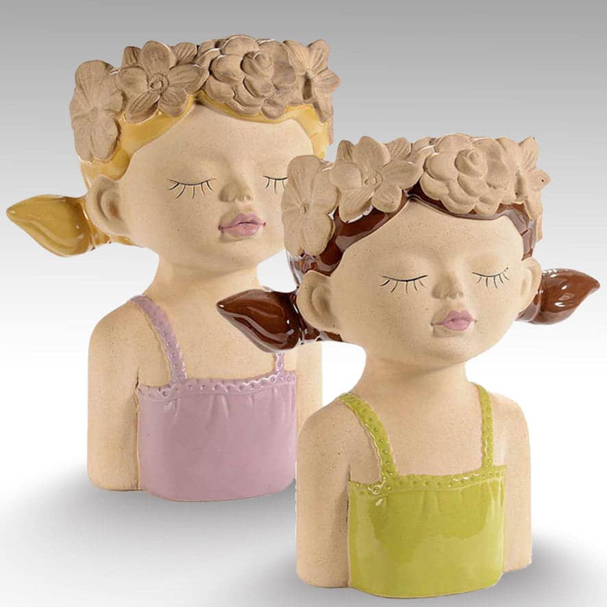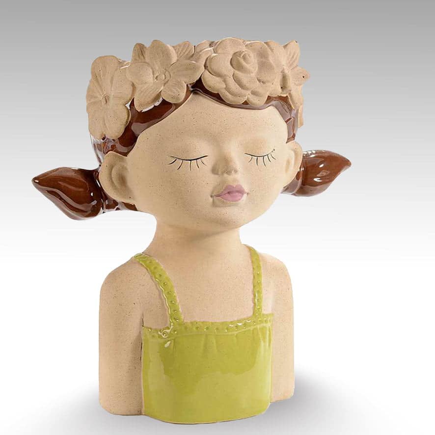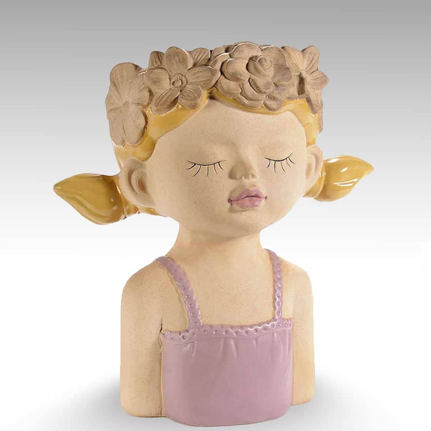 Vaso decorativo in porcellana colorata con volto di bimba, corona di fiori e codini