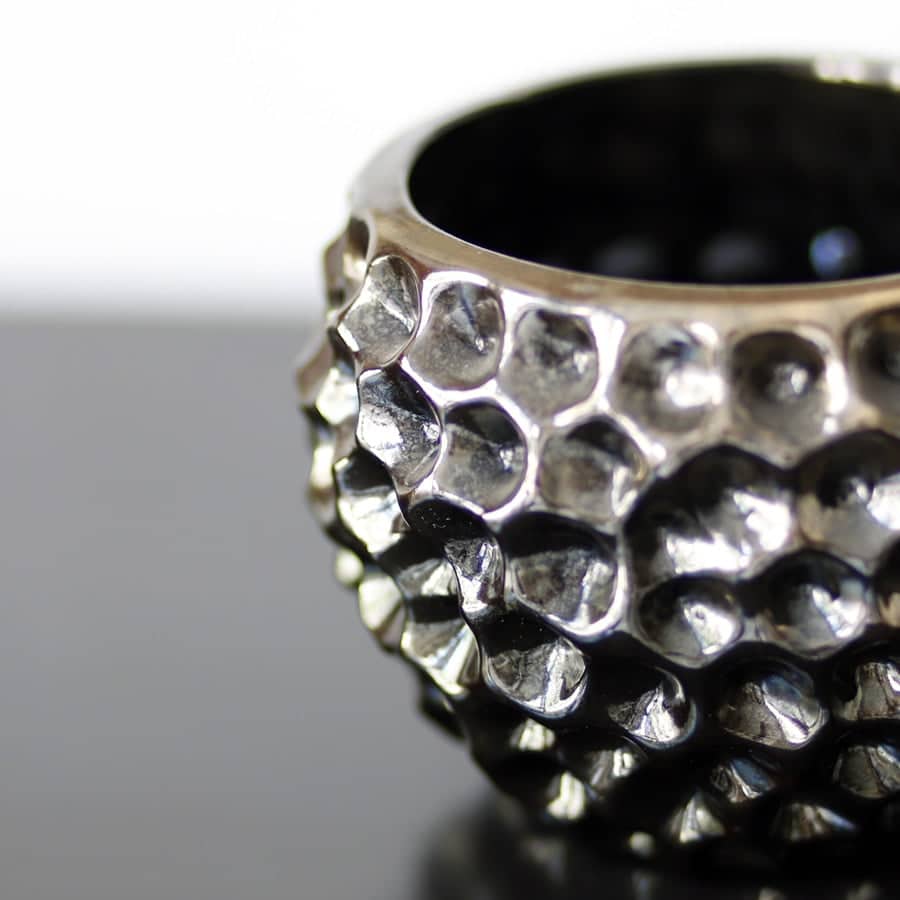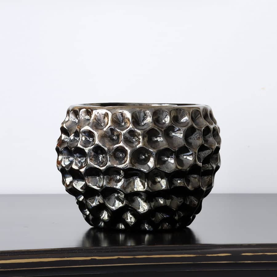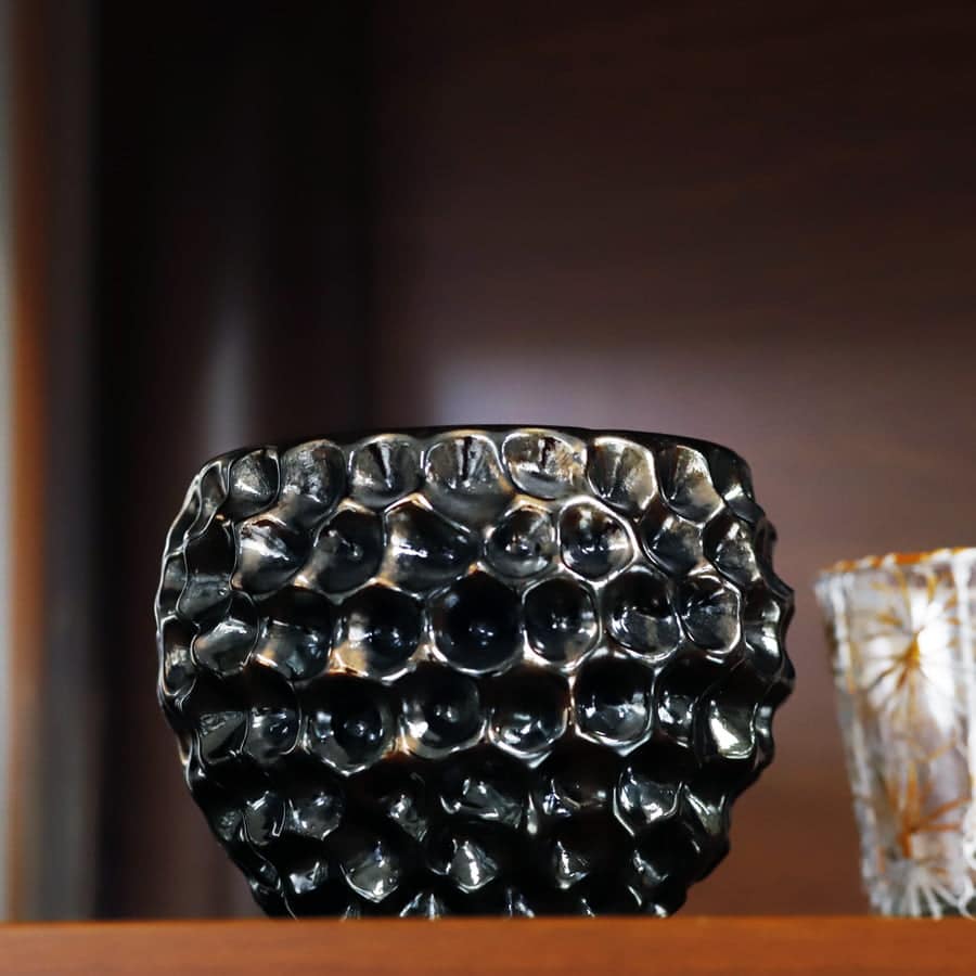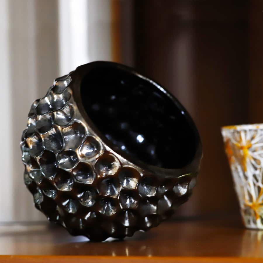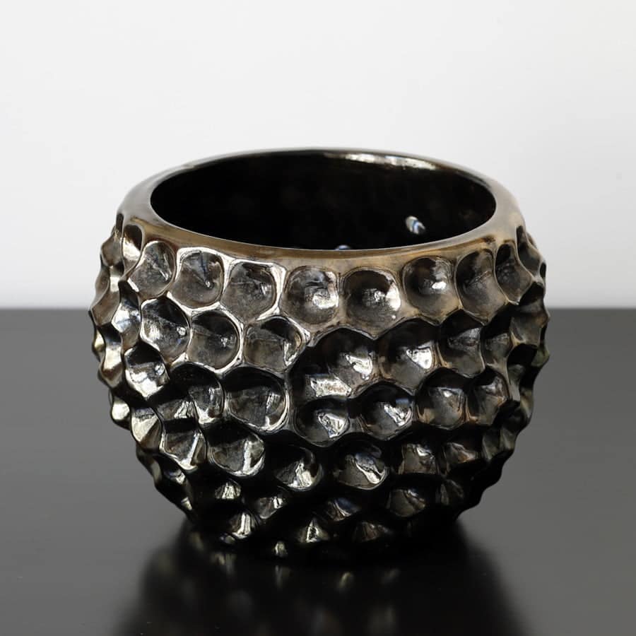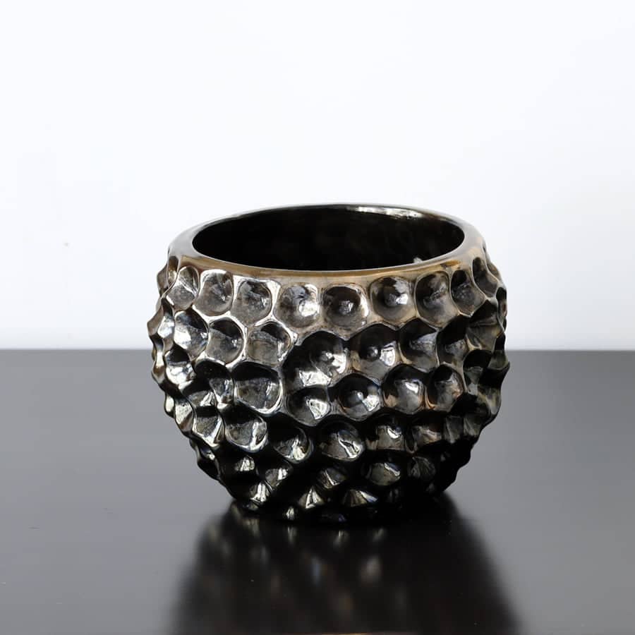 Il vaso in ceramica smaltata nero antracite ha una lavorazione particolare, con cerchi ad incavo che creano un riflesso della luce davvero accattivante e cangiante!